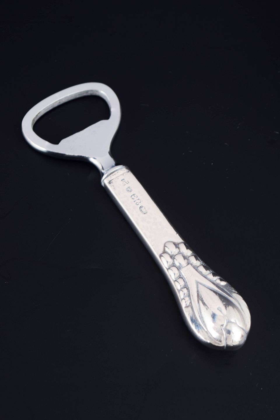Art deco flaskeåbner i tretårnet sølv og rustfrit stål. Model nummer 3 med enkel, geometrisk skaftform typisk for perioden. Fremstillet hos Evald Nielsen.