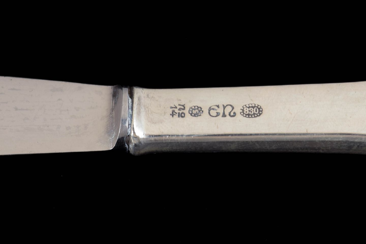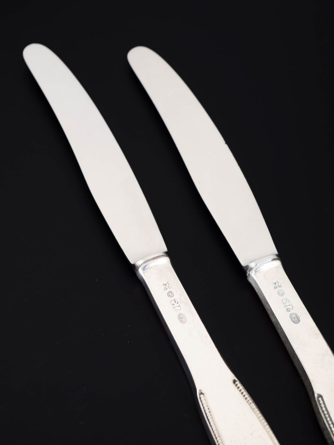 Elegante frokostknive i sølv 830 og rustfrit stål. Model nummer 14 med klassisk, let afrundet skaftform og glat klinge. Fremstillet hos Evald Nielsen.