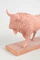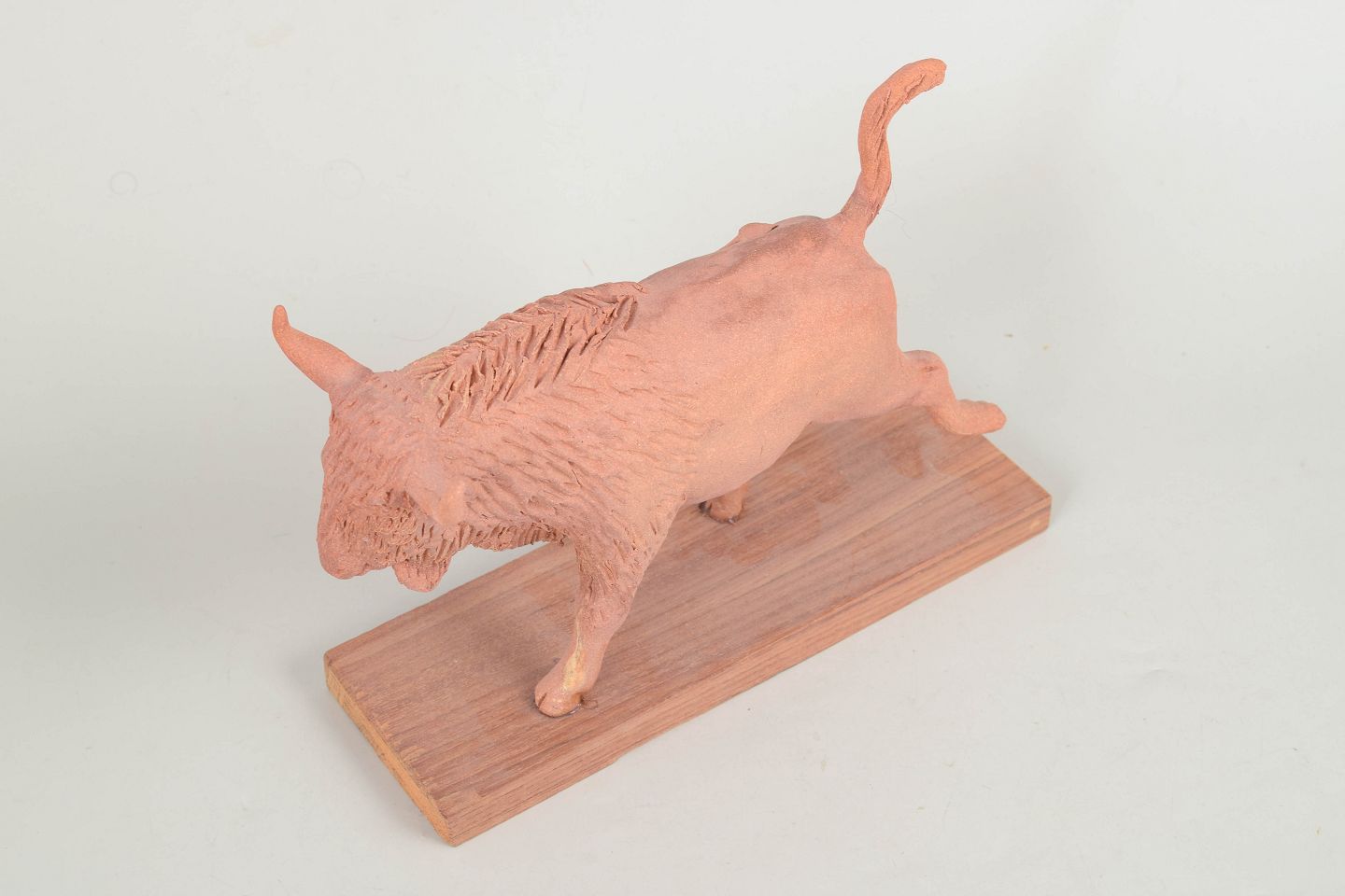 Unik keramisk figur forestillende en tyr udført i uglaseret ler monteret på en rektangulær træbase. Figuren er modelleret i en dynamisk bevægelse med løftet ben og detaljeret pelsstruktur, hvilket giver et kraftfuldt og skulpturelt udtryk. Usigneret unika fra 1970’erne.