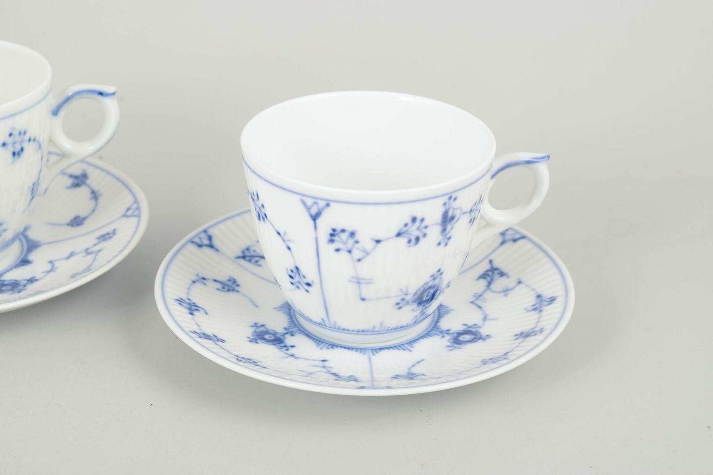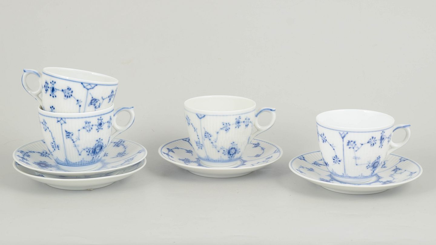 Royal Copenhagen Musselmalet Riflet, sæt af fire kaffekopper med underkopper.