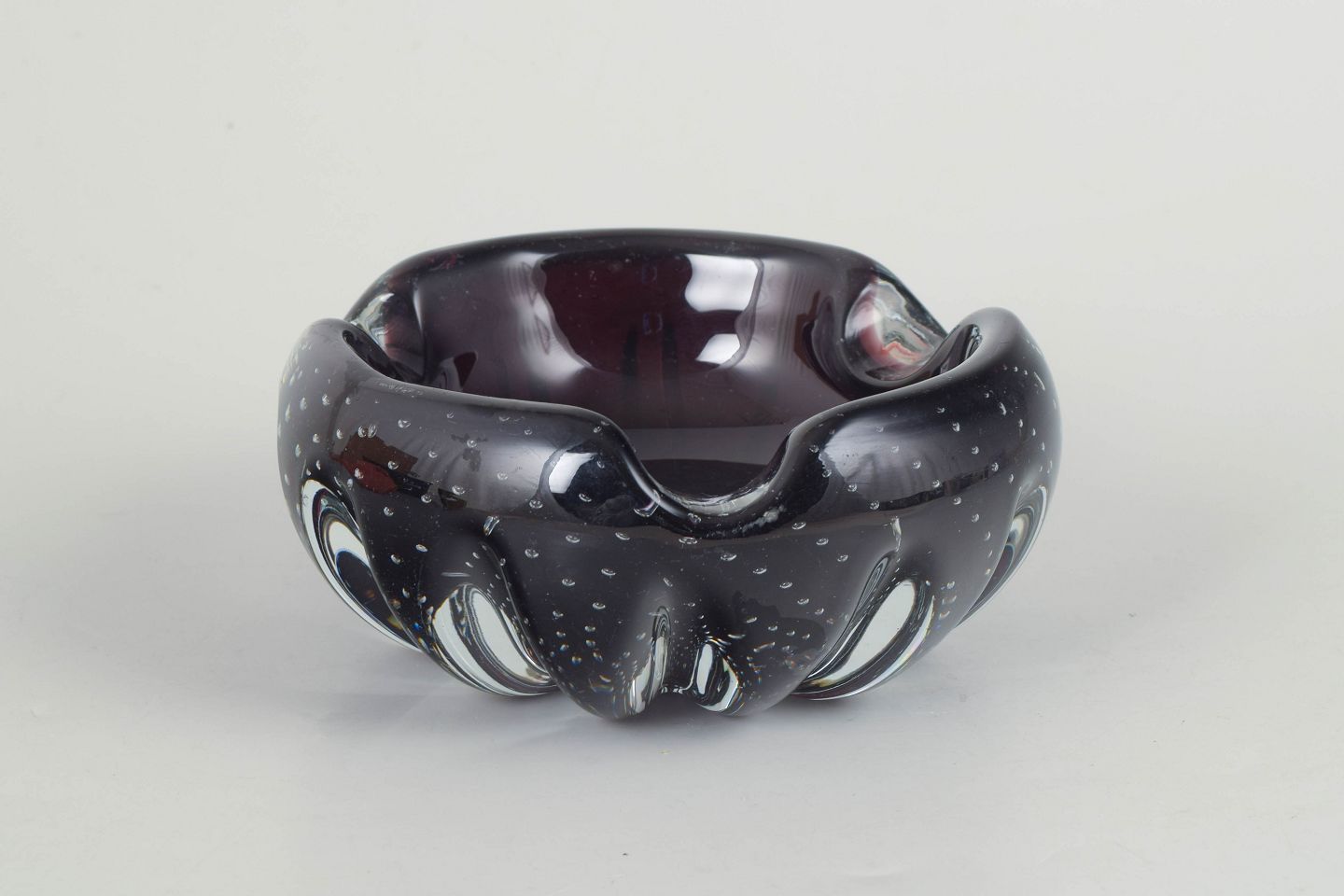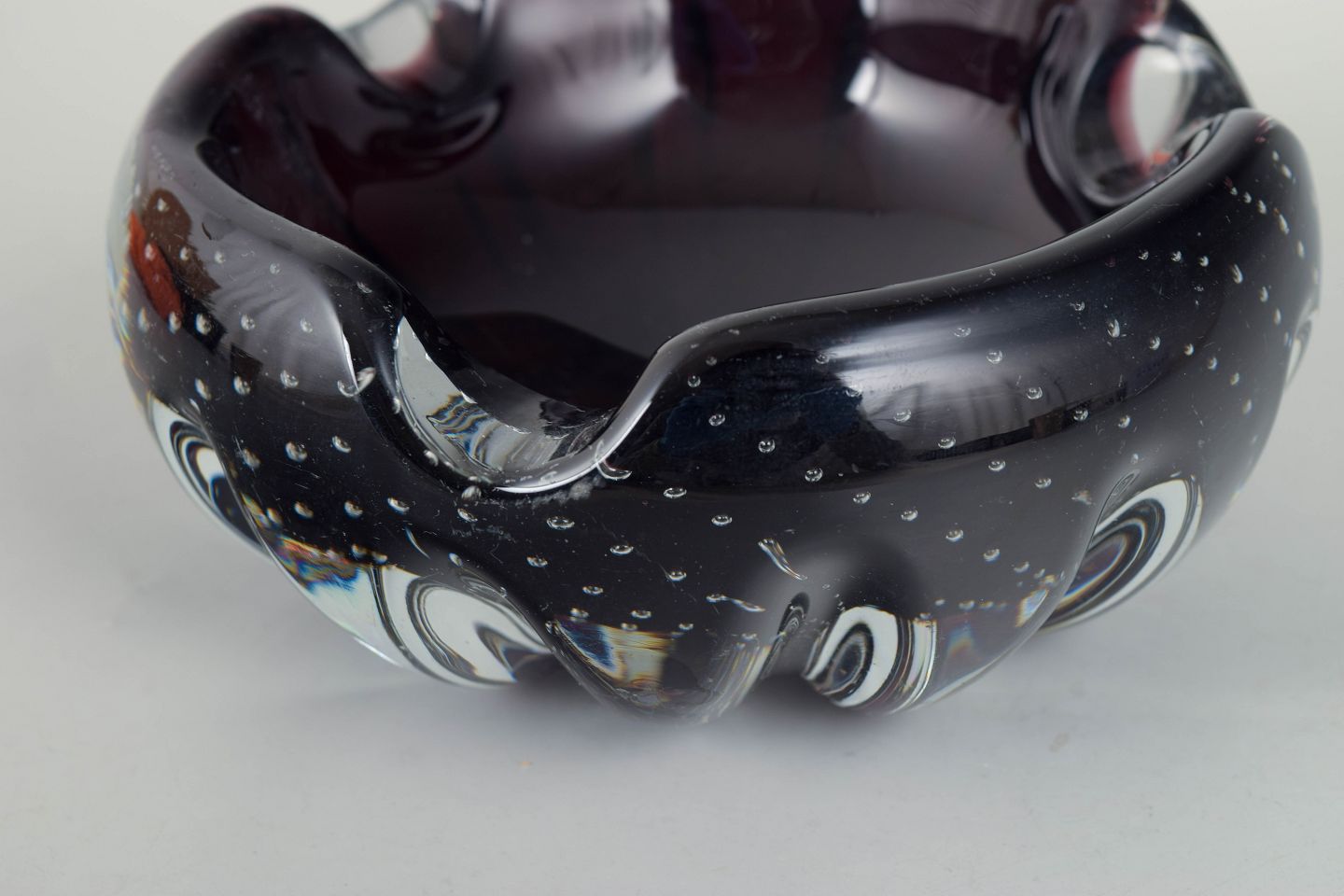 Kraftig kunstglasskål i mørkt glas med indkapslede luftbobler og organisk bølgende rand, udført i karakteristisk Murano-stil med skulpturel form.