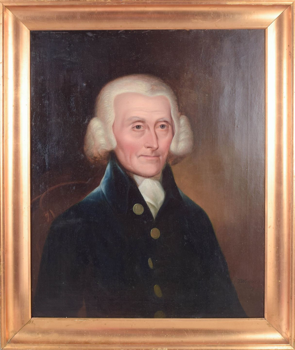 Portræt af en herre udført i klassisk engelsk portrætstil fra begyndelsen af 1800-tallet, med mørk baggrund og naturalistisk gengivelse af ansigt og påklædning. Malet i olie på lærred og dateret 1807.