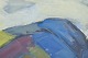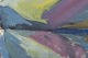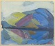 Modernistisk nordisk landskab med stiliserede former og spejling i vandflade, udført i brede penselstrøg og afdæmpede farver i blå, grønne og violette toner. Signeret.