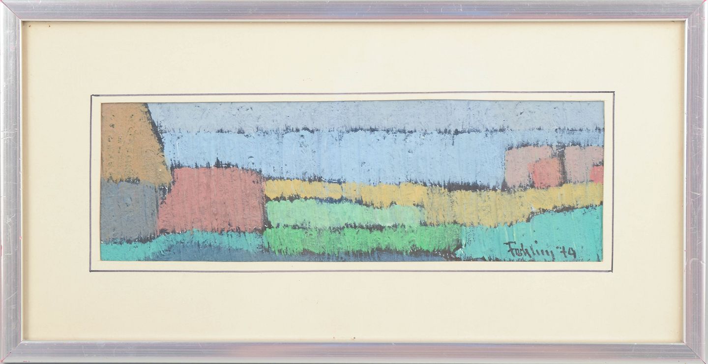 Abstrakt landskabskomposition udført i olie på papir med stiliserede former, der antyder huse og marker i et åbent landskab. Motivet er opbygget i horisontale farvefelter i blå, grønne, gule og rosa toner med en mørkere konturlinje langs horisonten.