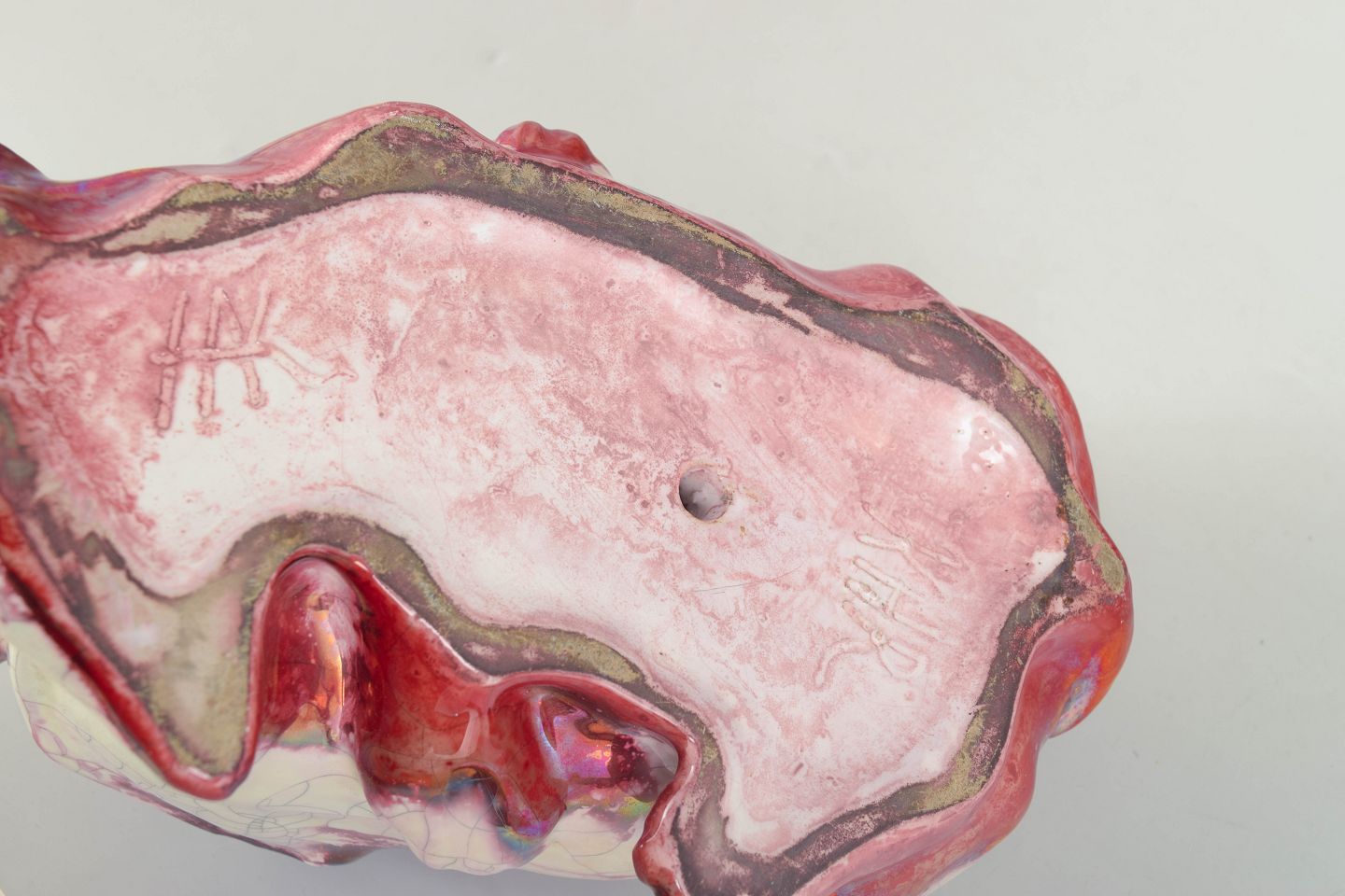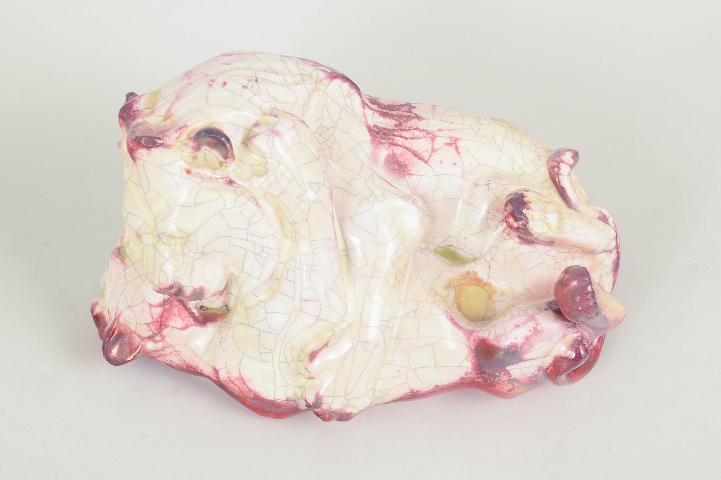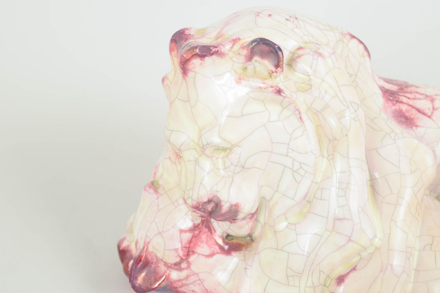 Naturalistically modelled figural group in glazed earthenware depicting a playful lion and lioness. Decorated with a rich red and cream crackle glaze with organic transitions.