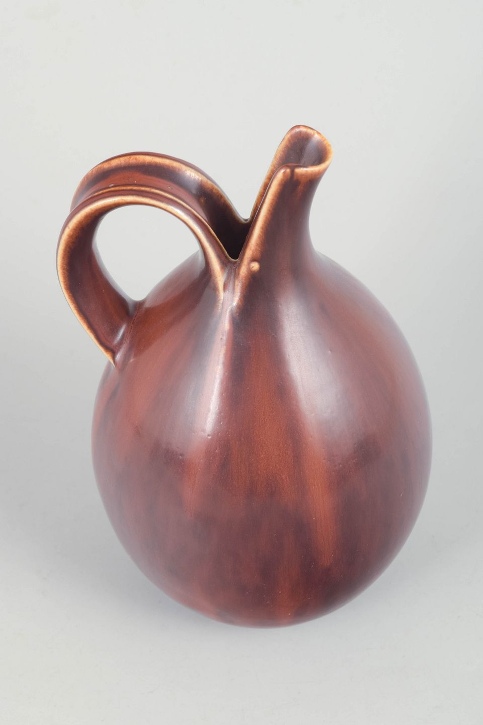 Organically shaped stoneware pitcher with rounded body, integrated handle and characteristic spout, executed in a deep reddish-brown glaze with warm tones.