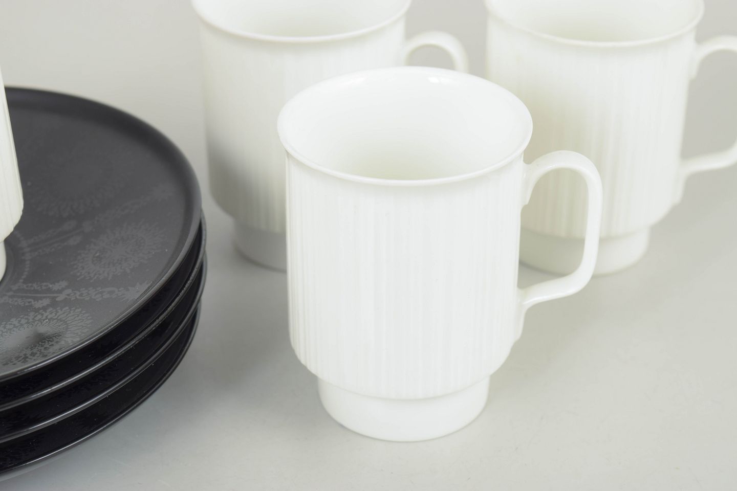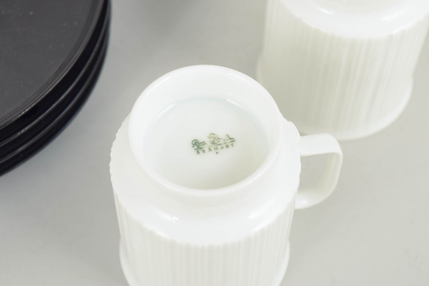 Elegant porcelain espresso cups with matching saucers, designed in a refined and functional style characteristic of Tapio Wirkkala’s work for Rosenthal in the 1980s.
