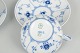 To tekopper med tilhørende underkopper i porcelæn med håndmalet dekoration i underglasurblå i det klassiske Musselmalet Riflet mønster. Model 1/315. Første sortering.