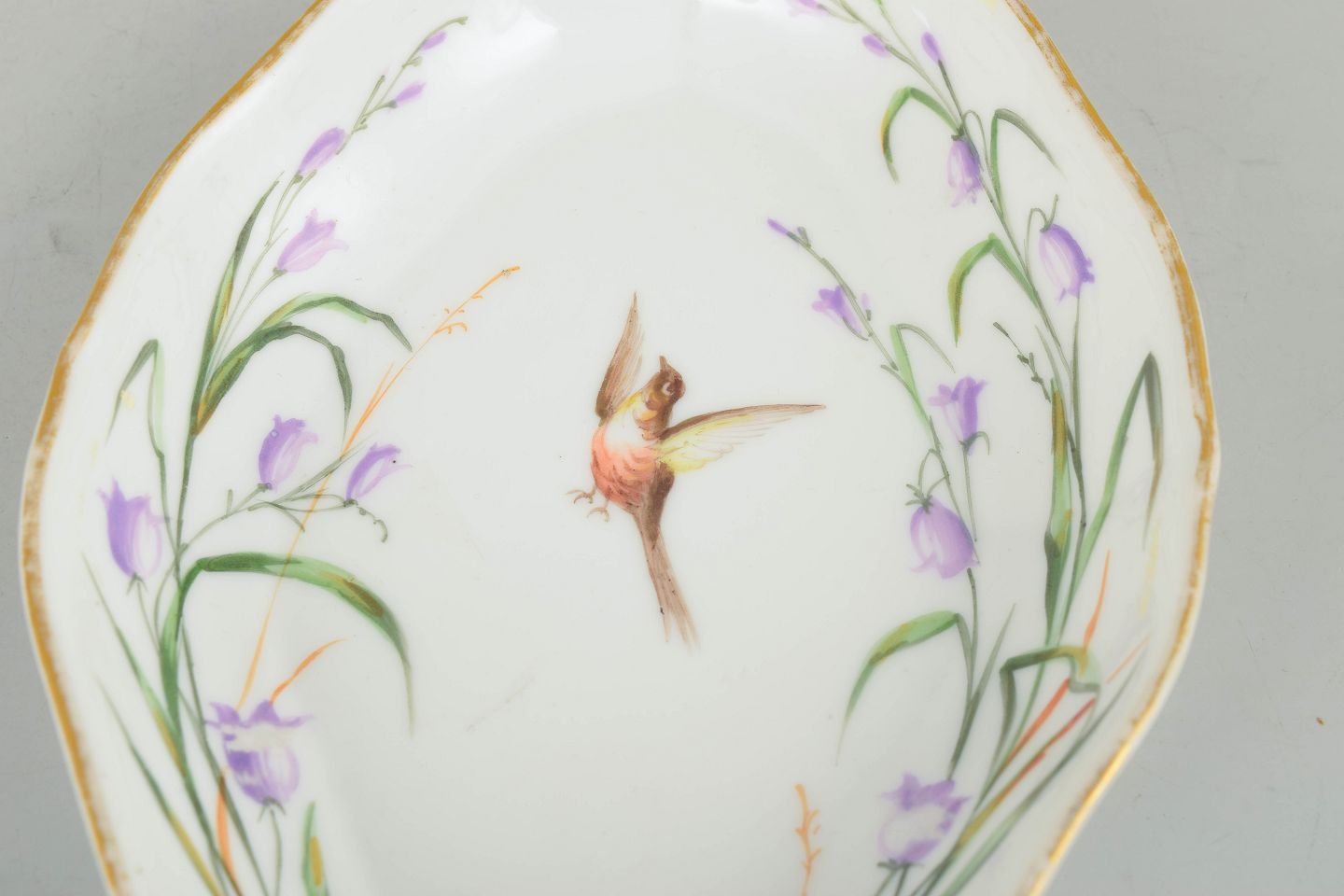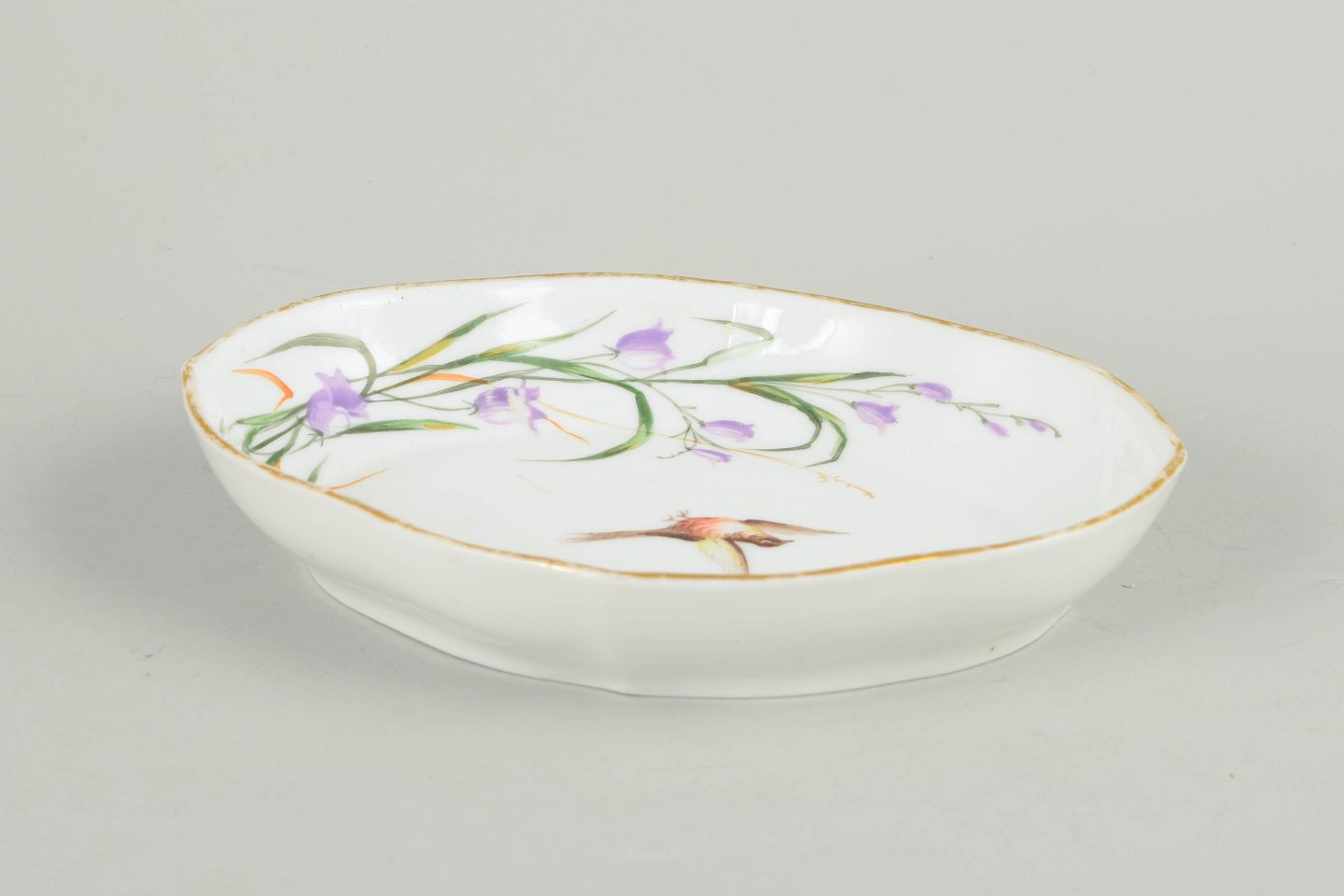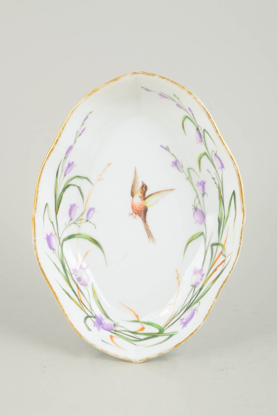 Antique oval dish in hand-painted porcelain featuring a central bird motif surrounded by floral decoration in purple and green tones, finished with a gilded rim.