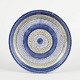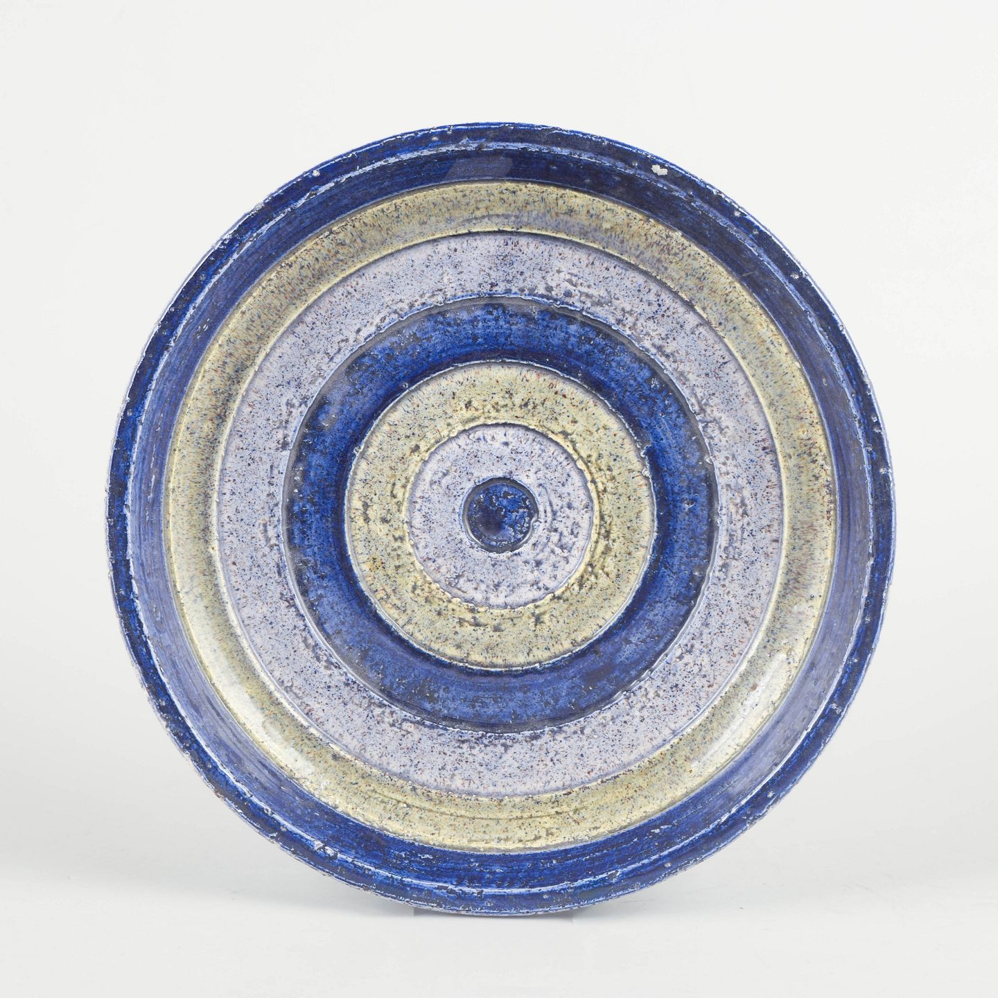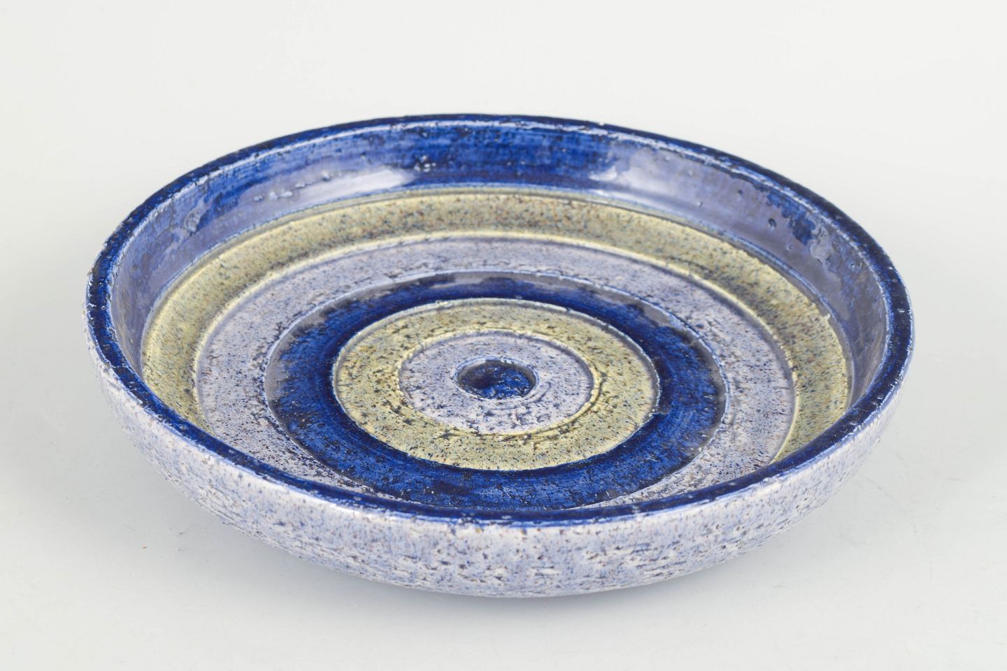 Handmade circular ceramic dish with concentric rings and characteristic glaze in blue, cream and sandy tones. Produced in the 1970s in Bitossi’s distinctive artistic style.