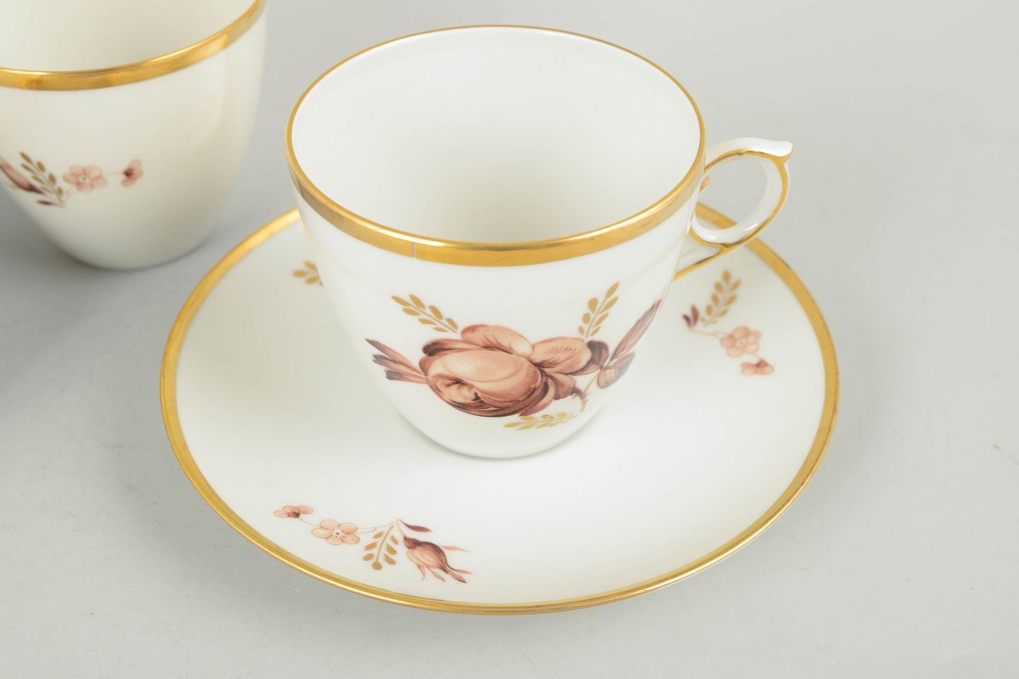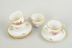 Kaffekopper med tilhørende underkopper i hvidt porcelæn med brun blomsterdekoration og guldkant, model 688/9069, fra 1970’erne, første sortering.