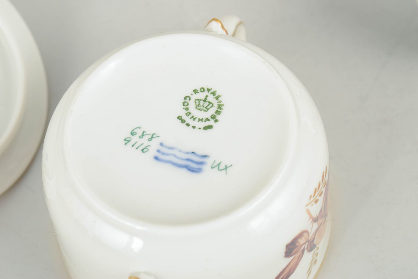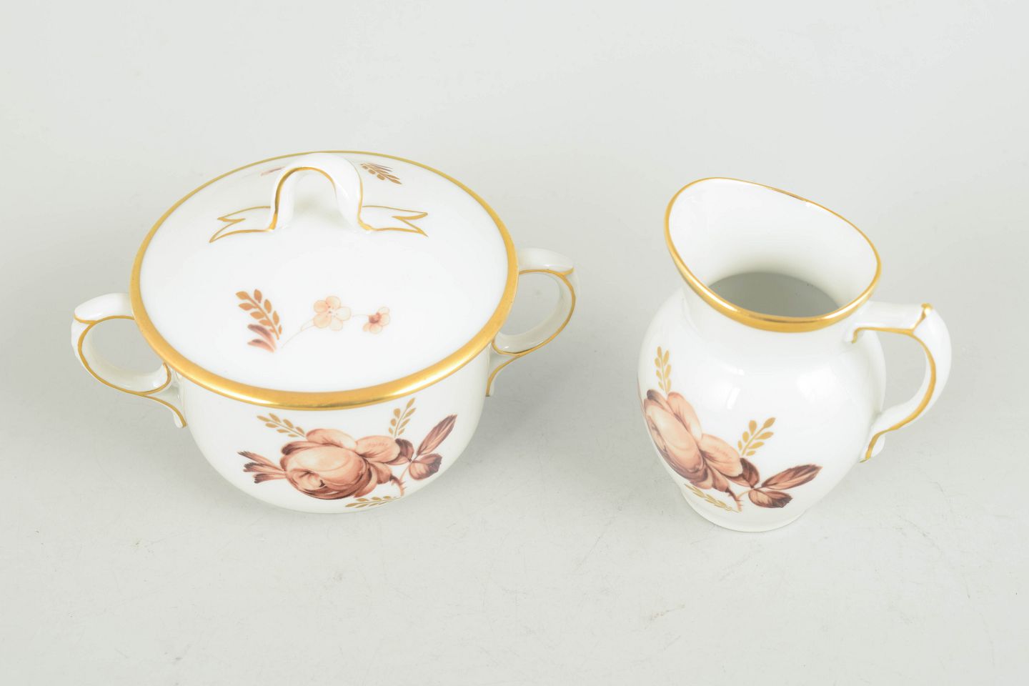 Sæt bestående af flødekande og sukkerskål i hvidt porcelæn med brun blomsterdekoration og guldkant, modeller 688/9228 og 688/9116, fra 1970’erne, første sortering.