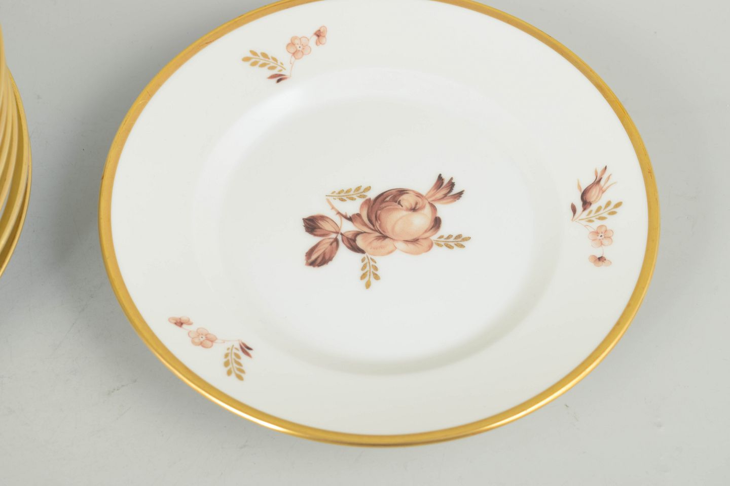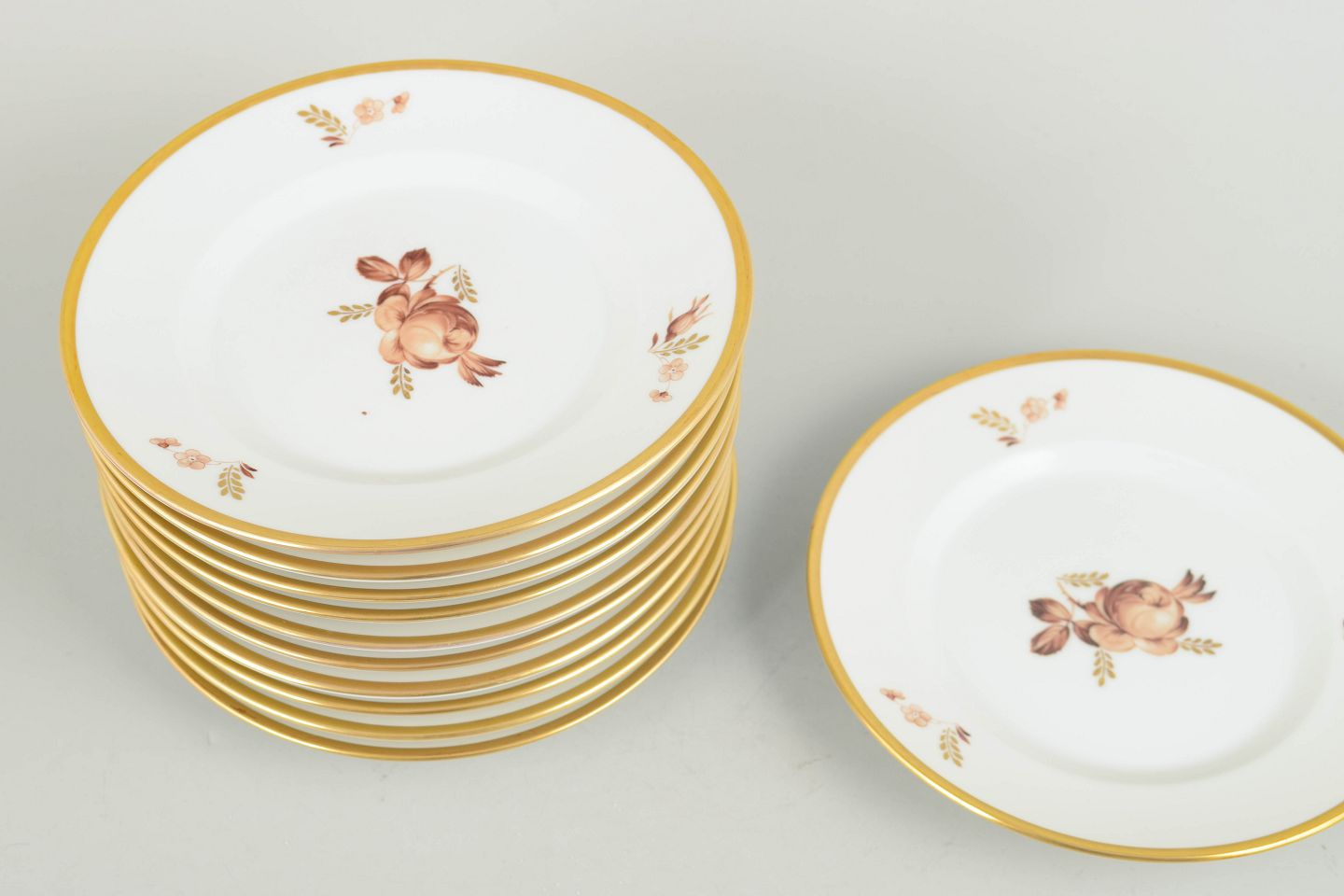 Royal Copenhagen brown rose, set of eleven plates.