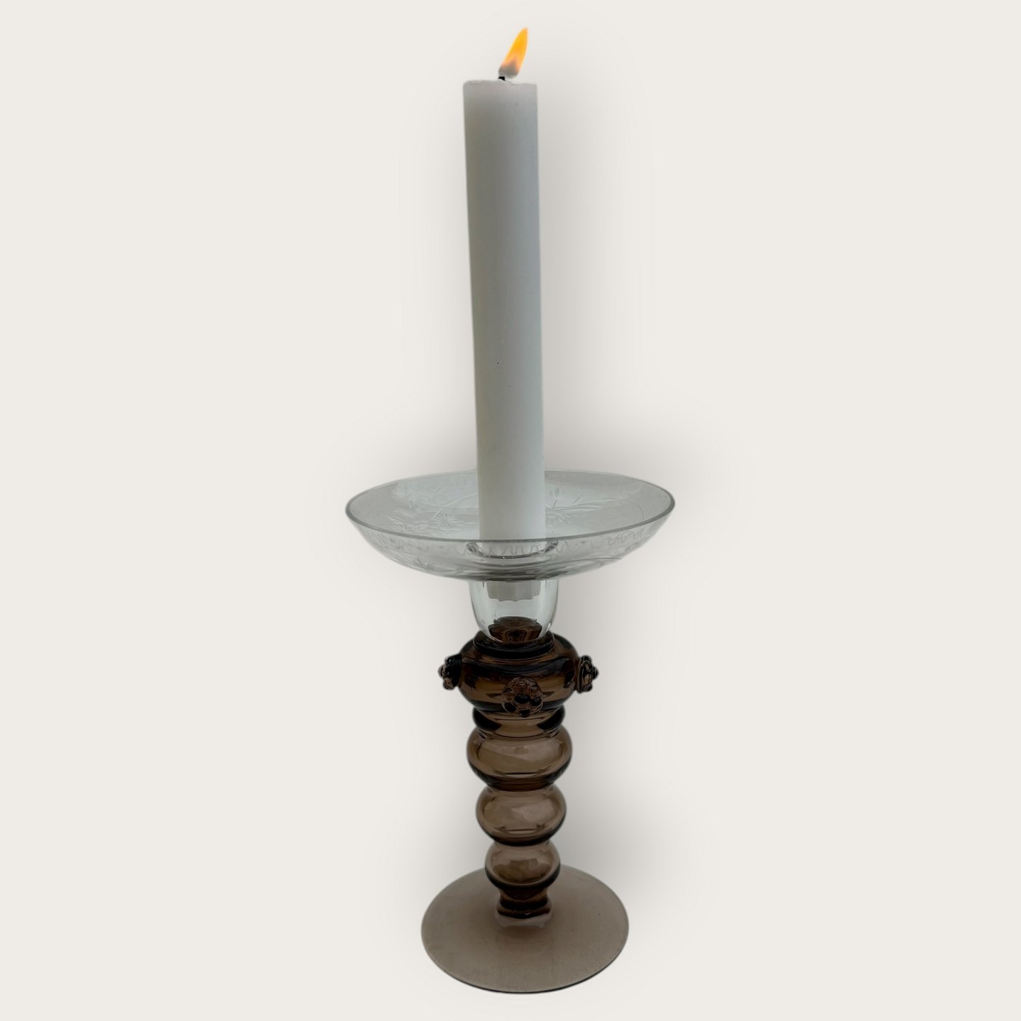 Old glass candlestick, hollow brown stem with rosettes, bowl with cuts of birds, patterns and flowers, nice condition, height 16.5cm, diameter 11cm