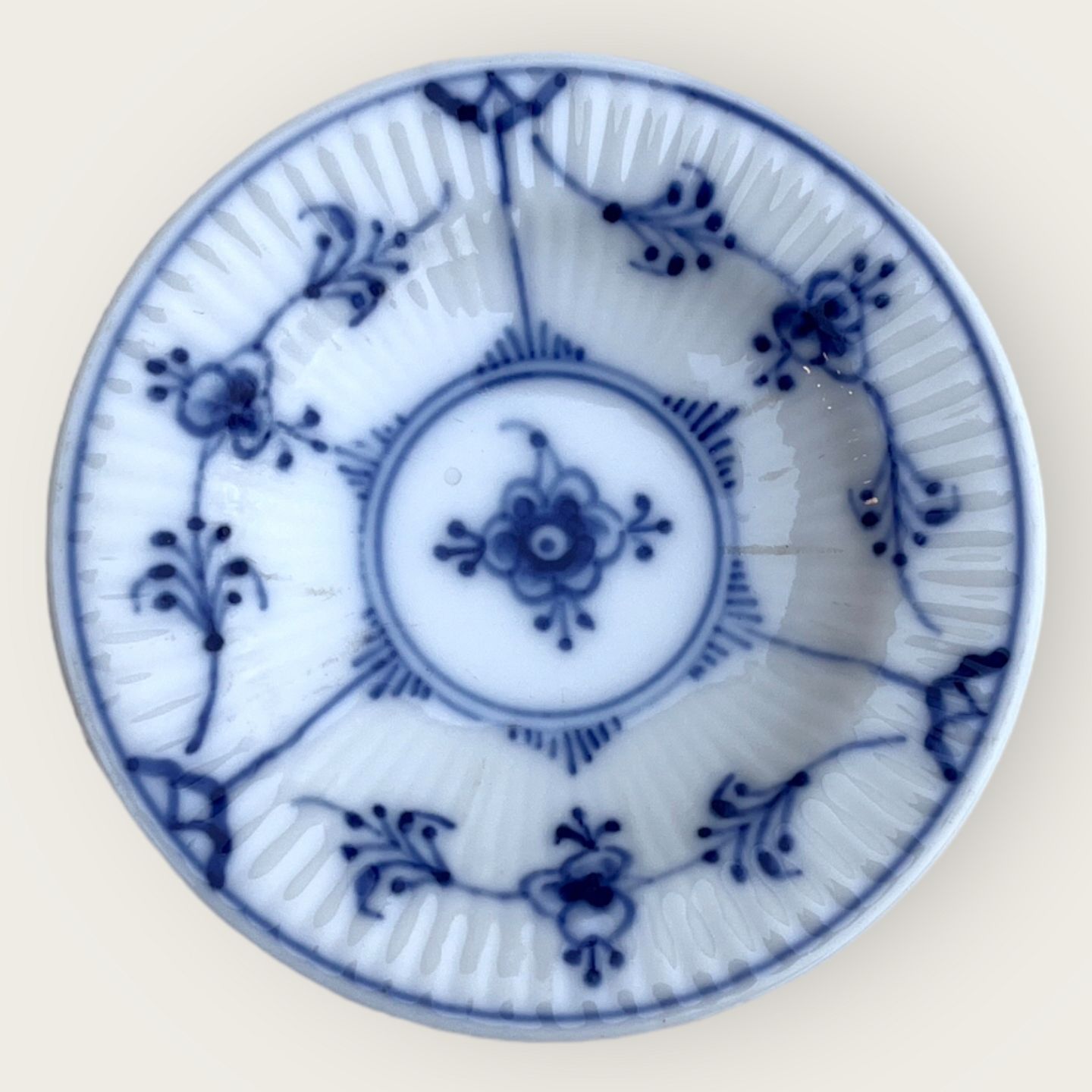Royal Copenhagen, Musselmalet, Riflet, Asiet #1/ 7, 7cm i diameter, 1.sortering *pæn stand*