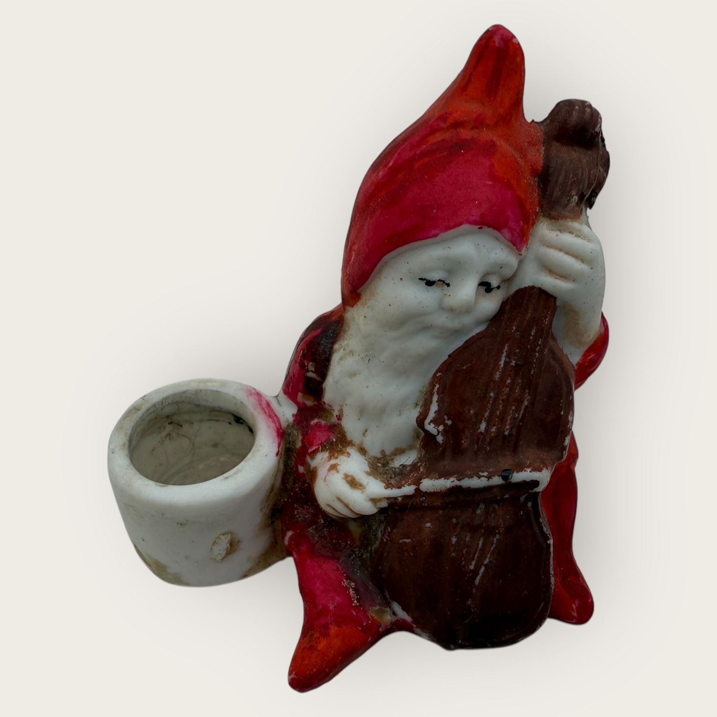 Bisquit nisse med lysestage og musikinstrument, ca. 5x5cm, Fra begyndelsen af 1900 tallet *Pæn Patineret stand*