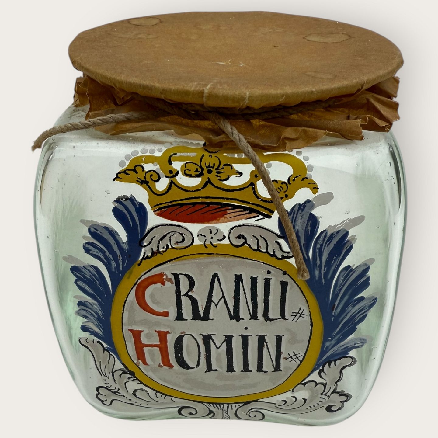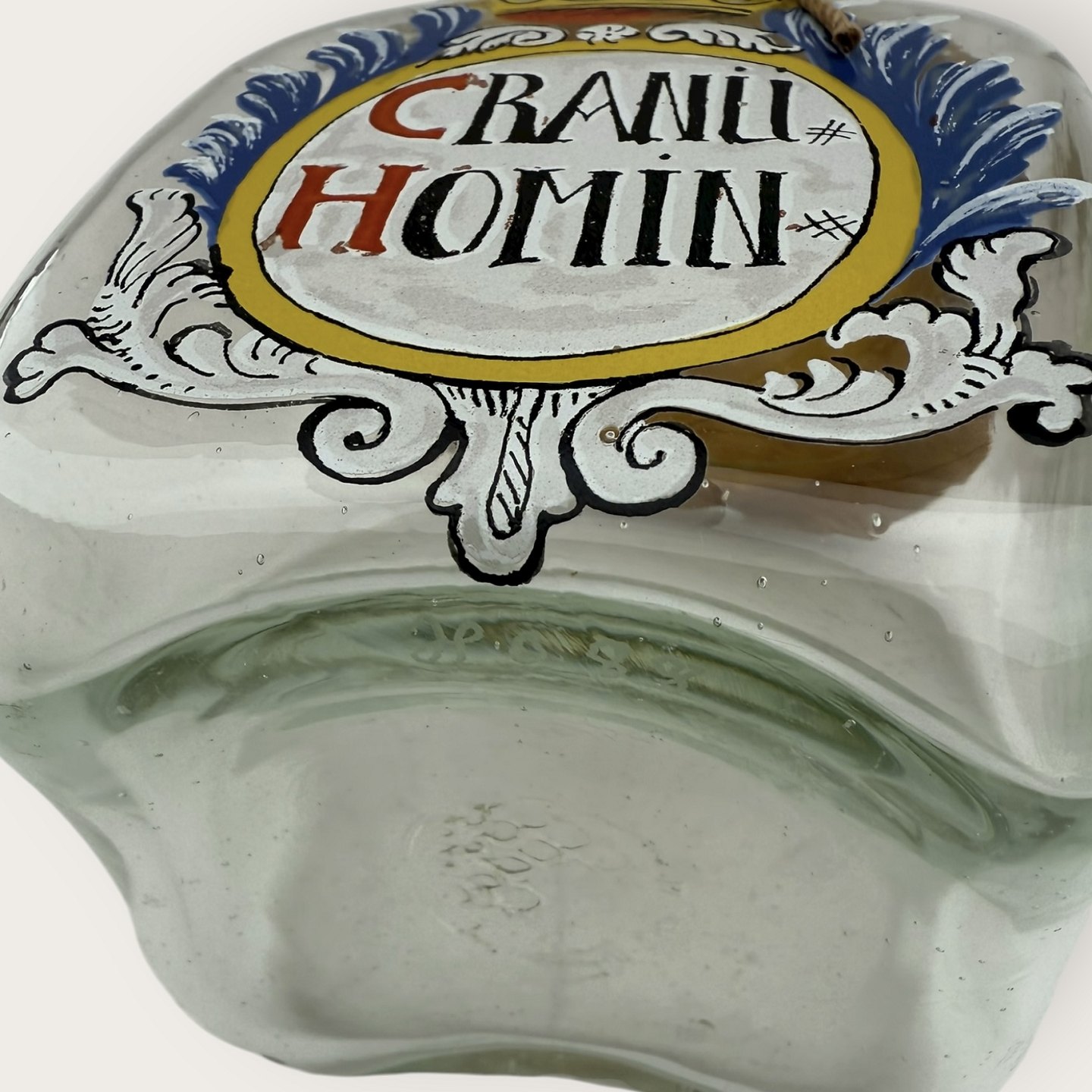 Holmegaard apotekerflaske fra 1988, Cranu Homin, Mål: 10x8,5x8,5cm, flaskerne er mundblæste kopier af originale gamle apotekerflasker, Signeret Hg88.