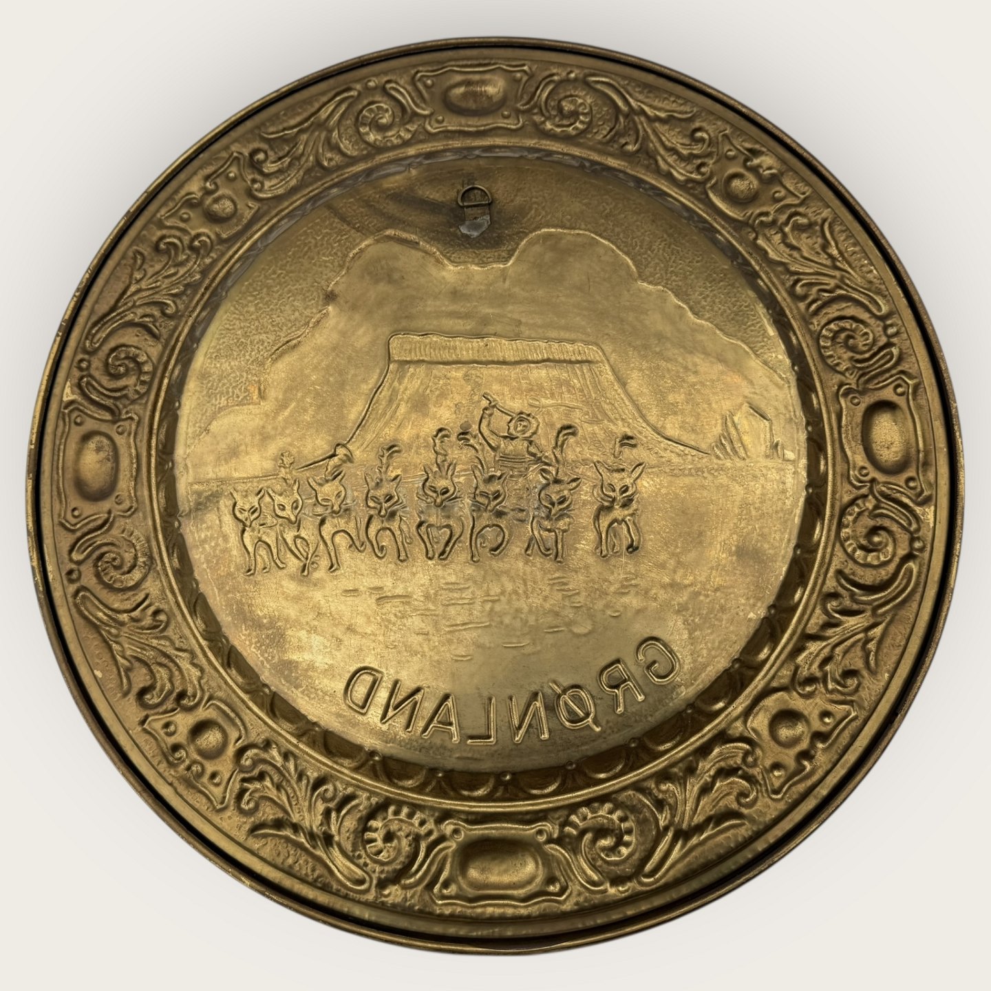 Messing fad, Hundeslæde på Grønland, diameter 43cm, Pæn patineret stand.