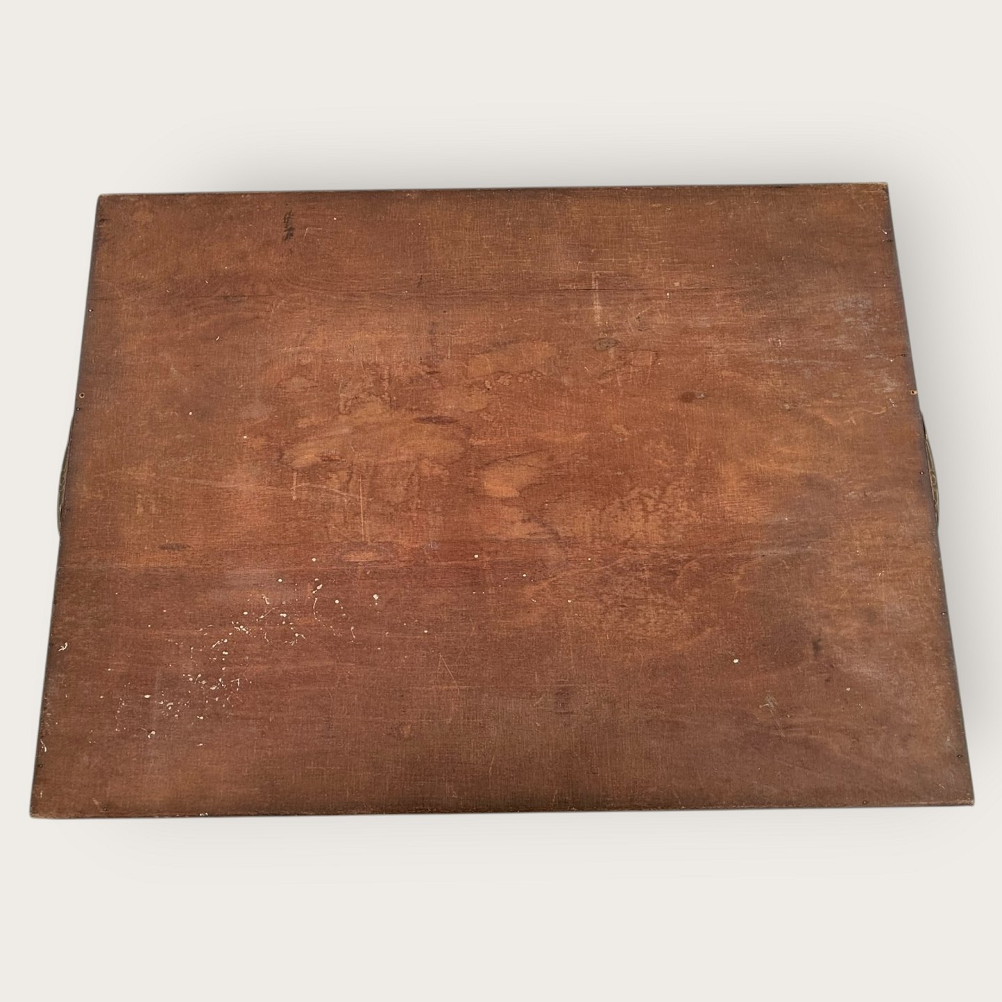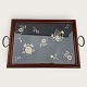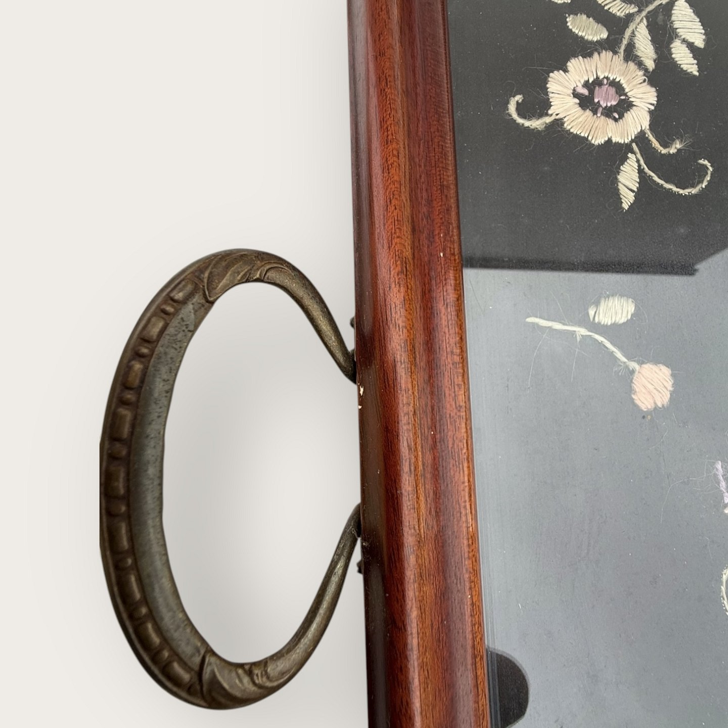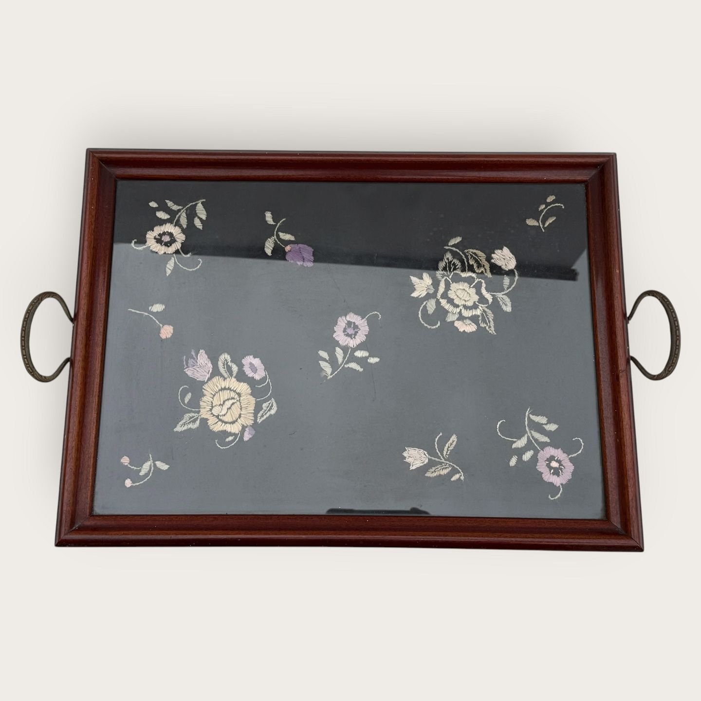 Bakke med metalhåndtag og broderi under glasplade, 35x47cm (uden hanke) *pæn stand*