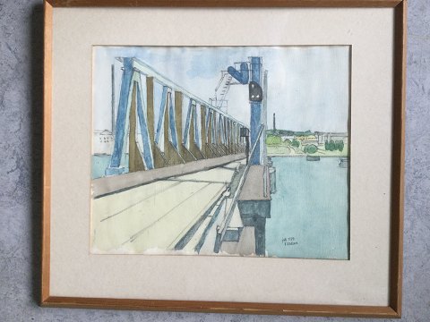 Ubekendt kunstner (20 årh): Komposition med bro 1979. Måske Jernbanebroen mellem Aalborg og Nørresundby? Akvarel på papir. Sign.: Villadsen Dateret Juli 1979 32x40 (48x55)