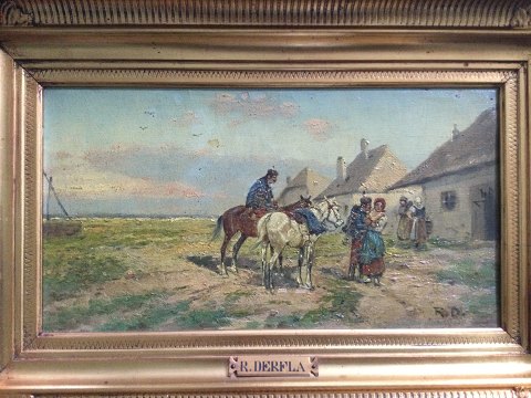 Anton Rudolf Derfla (født 1849): 2 malerier med Bosniske Husarer på stop ved huse på vejen. Olie på plader Det ene sign.: R.D. - det andet sign.: R. Derfla Messingskilte - R: DERFLA 17x31 (28x42)