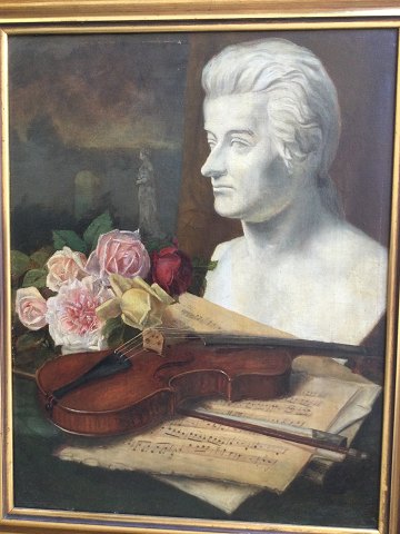 Alice Lynge (19/20 årh): Opstilling på bord med violin, partitur, rosenbuket og buste. Olie på lærred. Sign.: Alice Linge 54x42 (65x53)