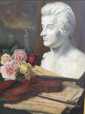 Alice Lynge (19/20 årh): Opstilling på bord med violin, partitur, rosenbuket og buste. Olie på lærred. Sign.: Alice Linge 54x42 (65x53)
