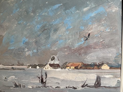 Vinterlandskab ved Vejlby Kirke ved Strib på Fyn 1972.