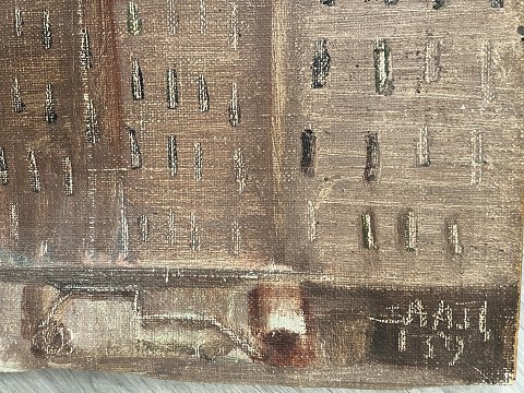 Svend Aage Tauscher (1911-82): Byparti med person og bil 1959. Olie på lærred ikke monteret på blindramme Sign.: Monogram 59. Uden ramme og ikke monteret på blindramme 32x48 026