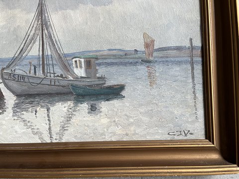 Chr. Jensen Virklund (født 1896): Havneparti, Silkeborg. Olie på lærred. Sign.: CJV 32x44 (39x50)