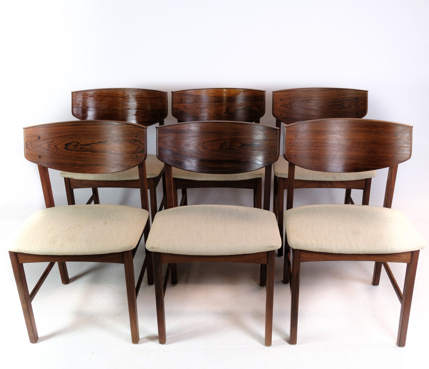 SoldSet of six dining chairs in rosewood with light fabric of Danish design from around the 1960s.