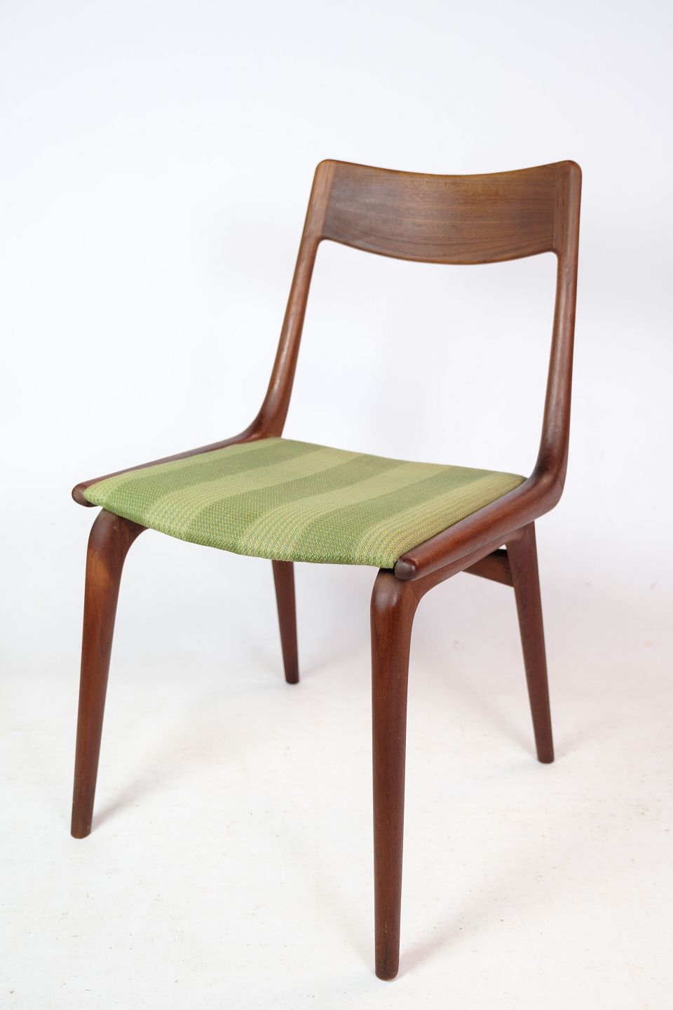 The chairs have a characteristic shape that gives a unique and attractive style. With their carved backrest in the shape of a boomerang, they give a unique and ergonomic shape to the back. The seat is upholstered with green striped fabric, which creates a beautiful contrast to the warm color of the teak wood.