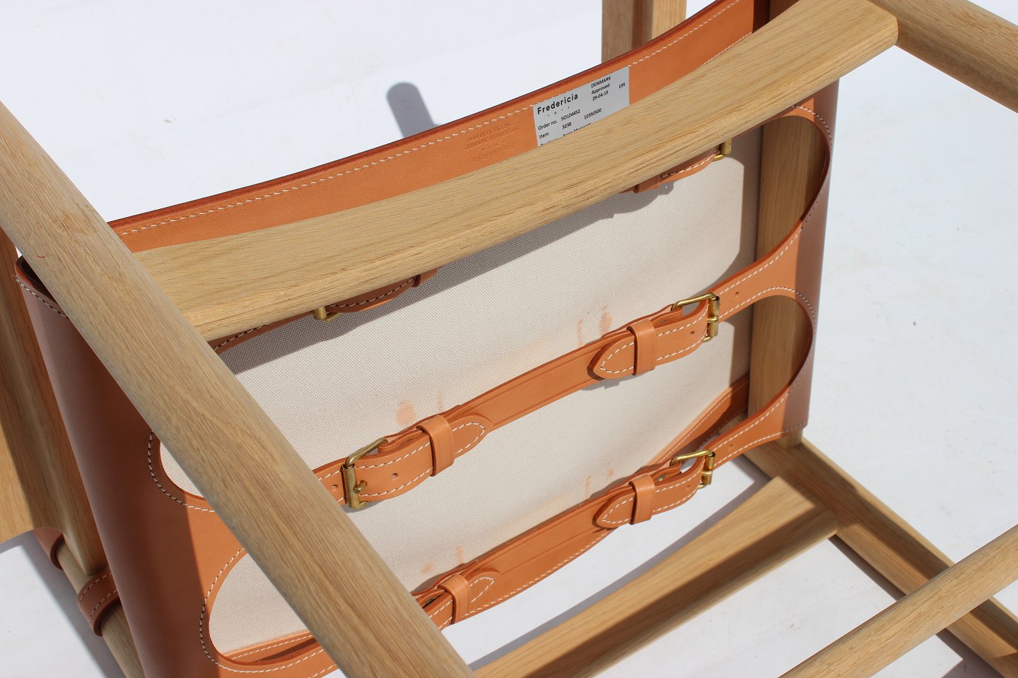 SoldThe Spanish dining chair with armrests, model 3238, designed by Børge Mogensen and manufactured by Fredericia Furniture in 2019. The chair is of oak and cognac leather.