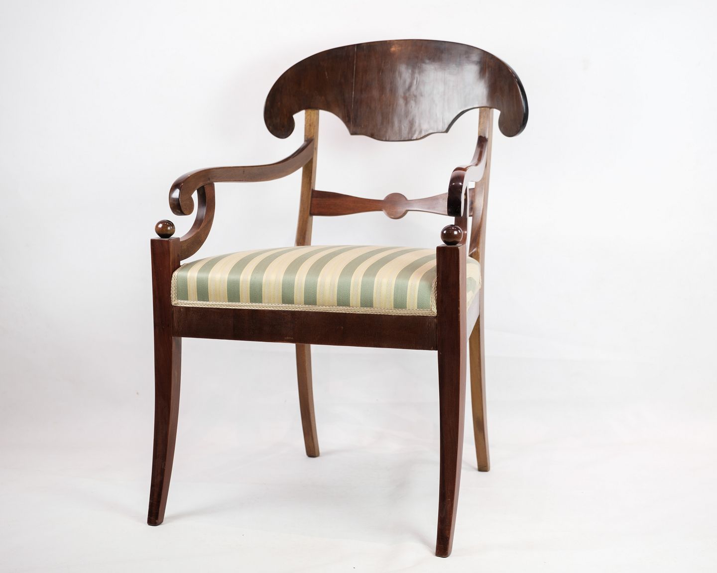 SolgtSen empire armstol i mahogni med lyst stribet stof fra omkring år 1840. Står i meget fin brugt stand.