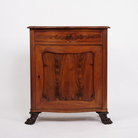 Antikt ovalt piedestalskab i mahogni med udskæringer og smuk struktur i træet fra omkring år 1840'erne.