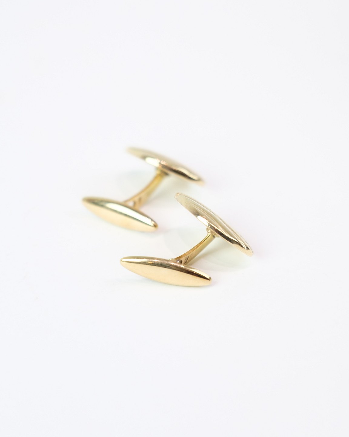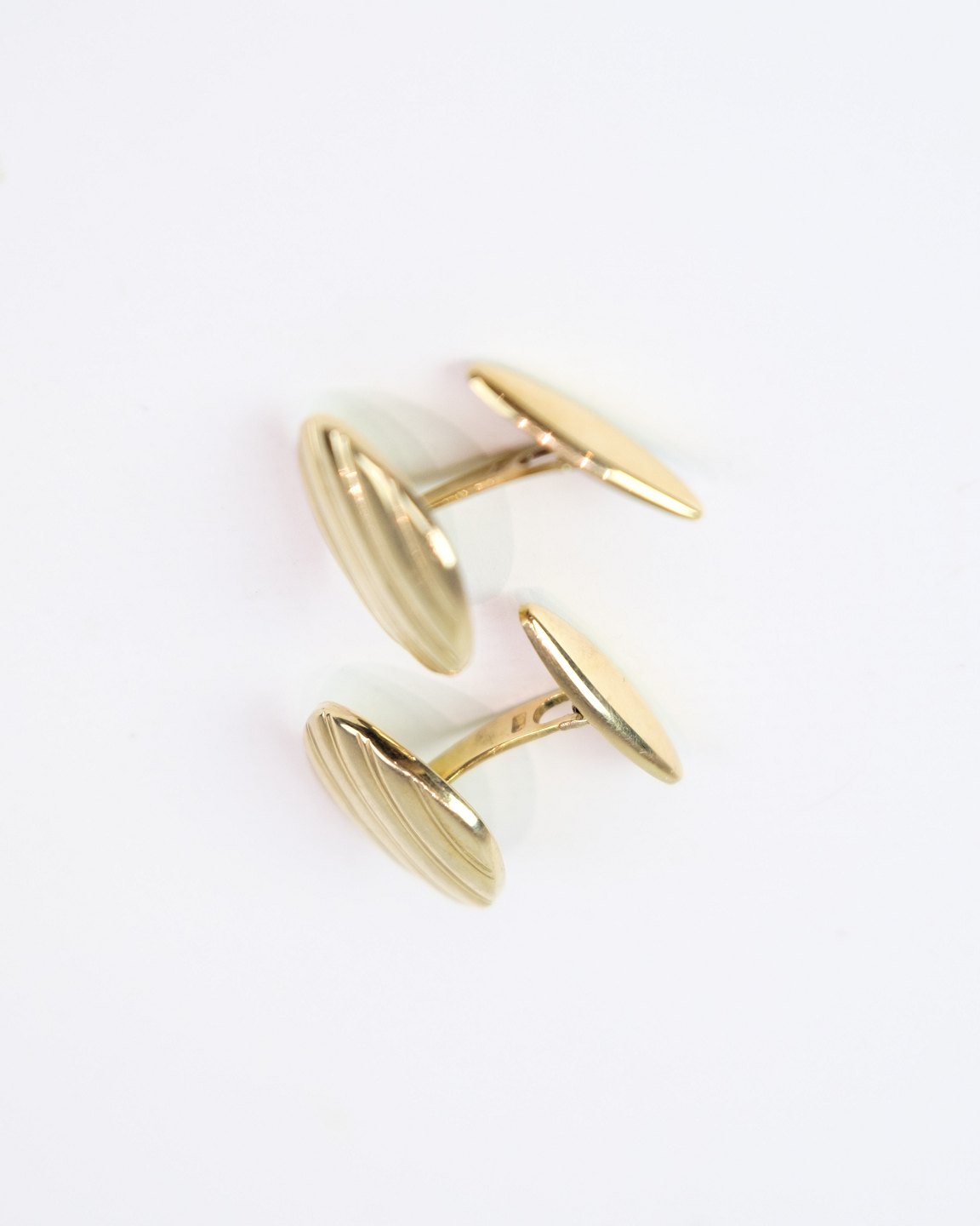 Manchetknapper i 14 kt. guld, stemplet 585. Rillet design. L: 2 cm, Dia: 1,5 cm. Vægt: 6,7 g. Klassisk herresmykke.