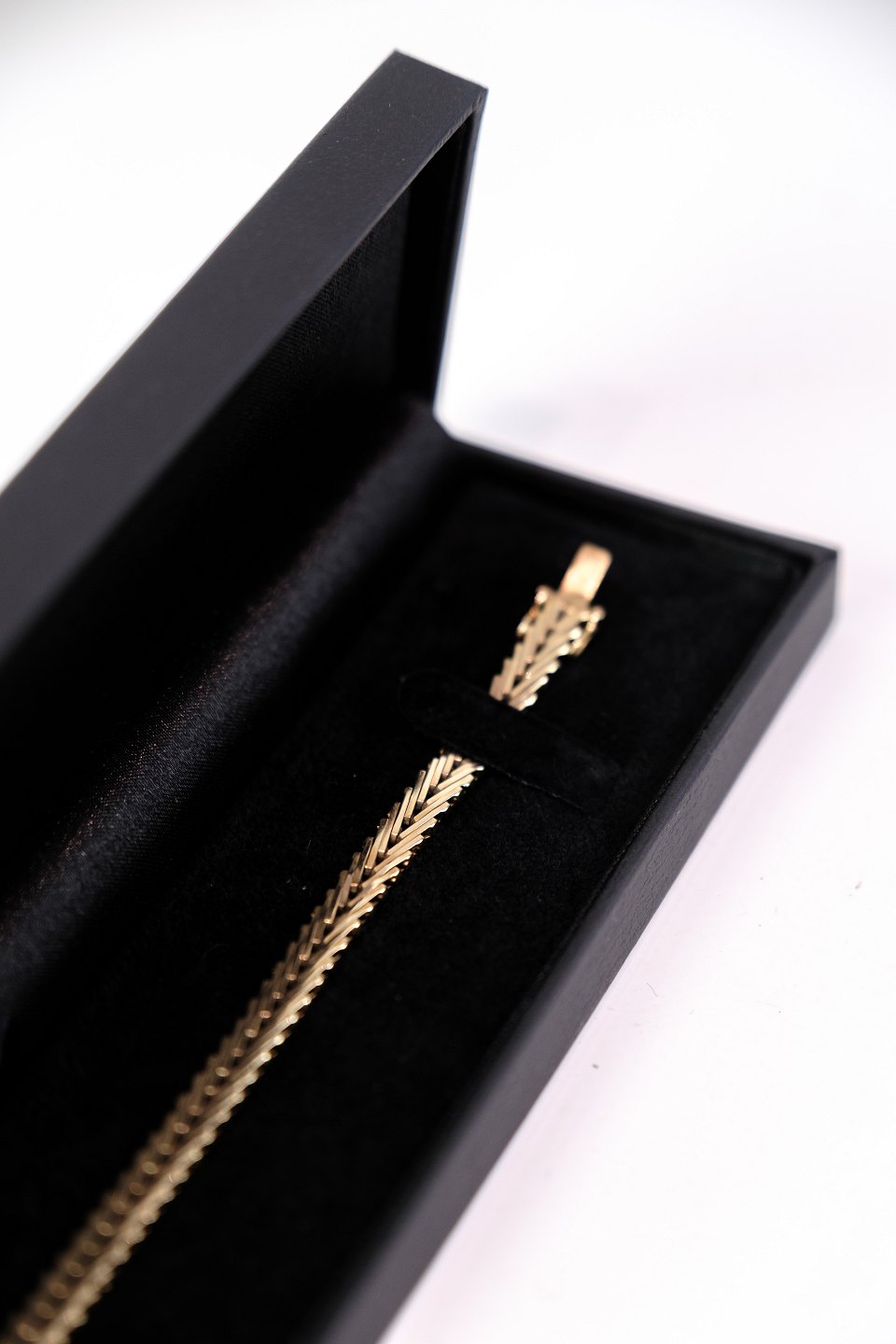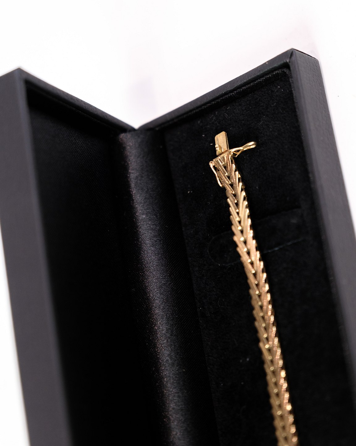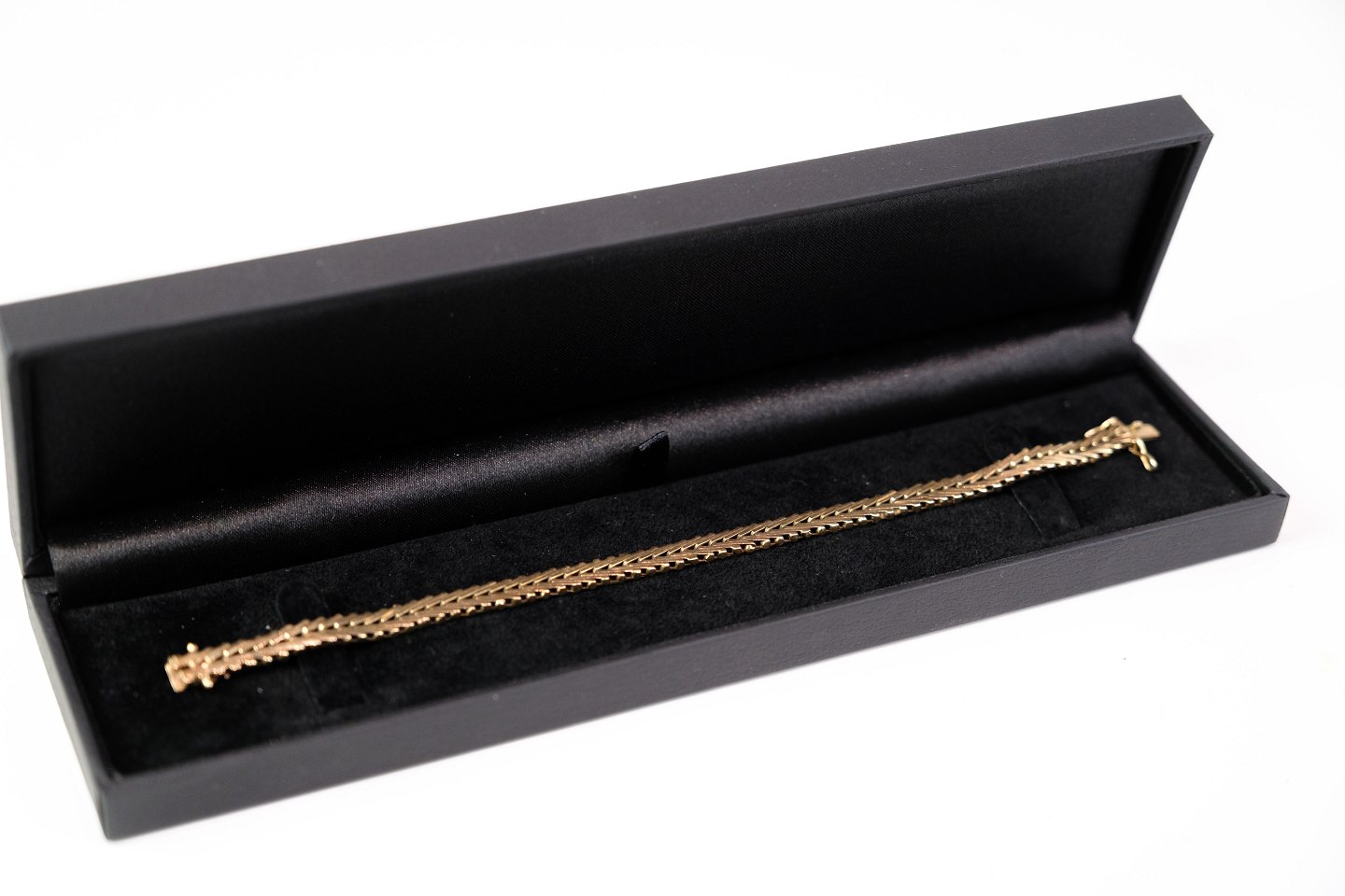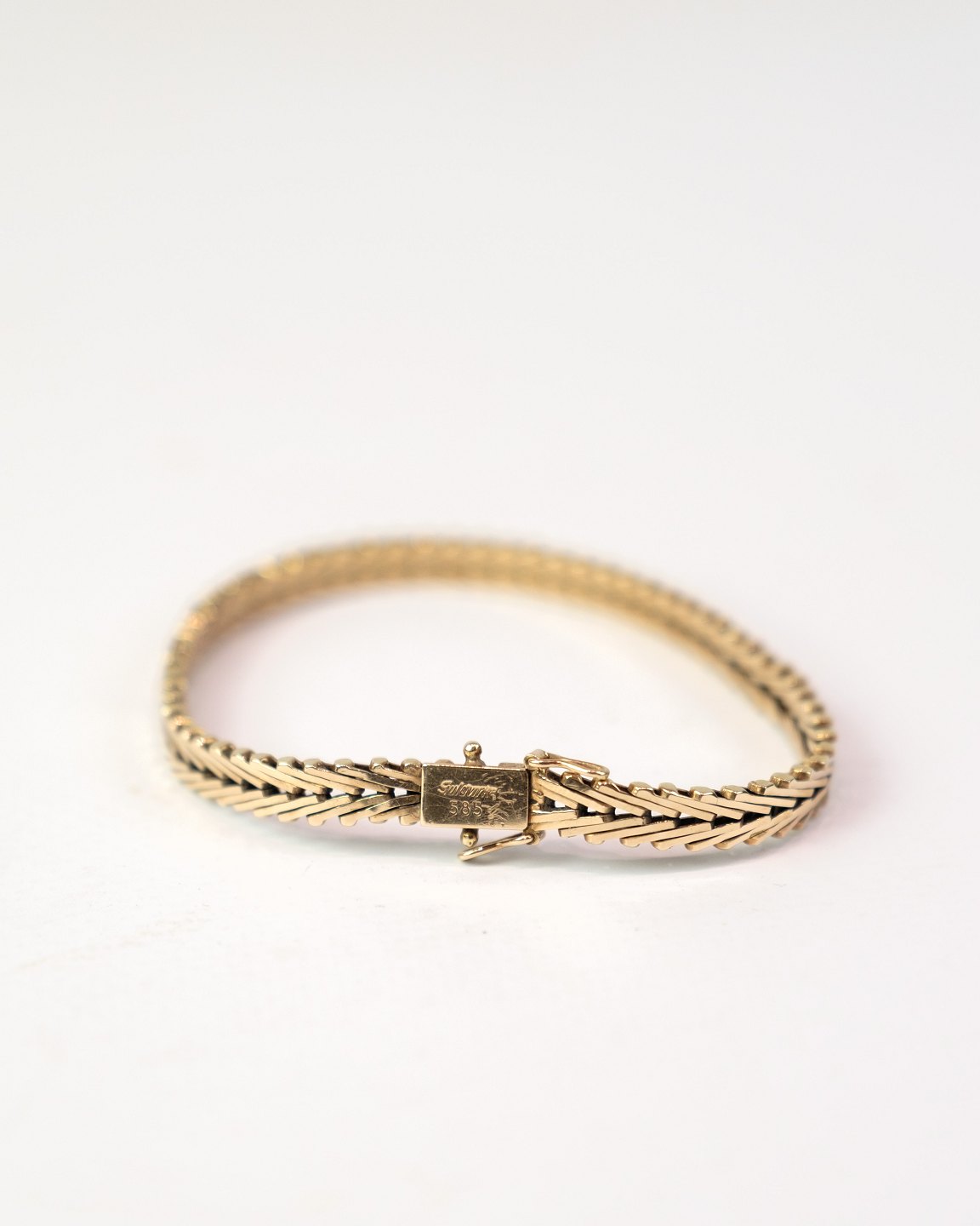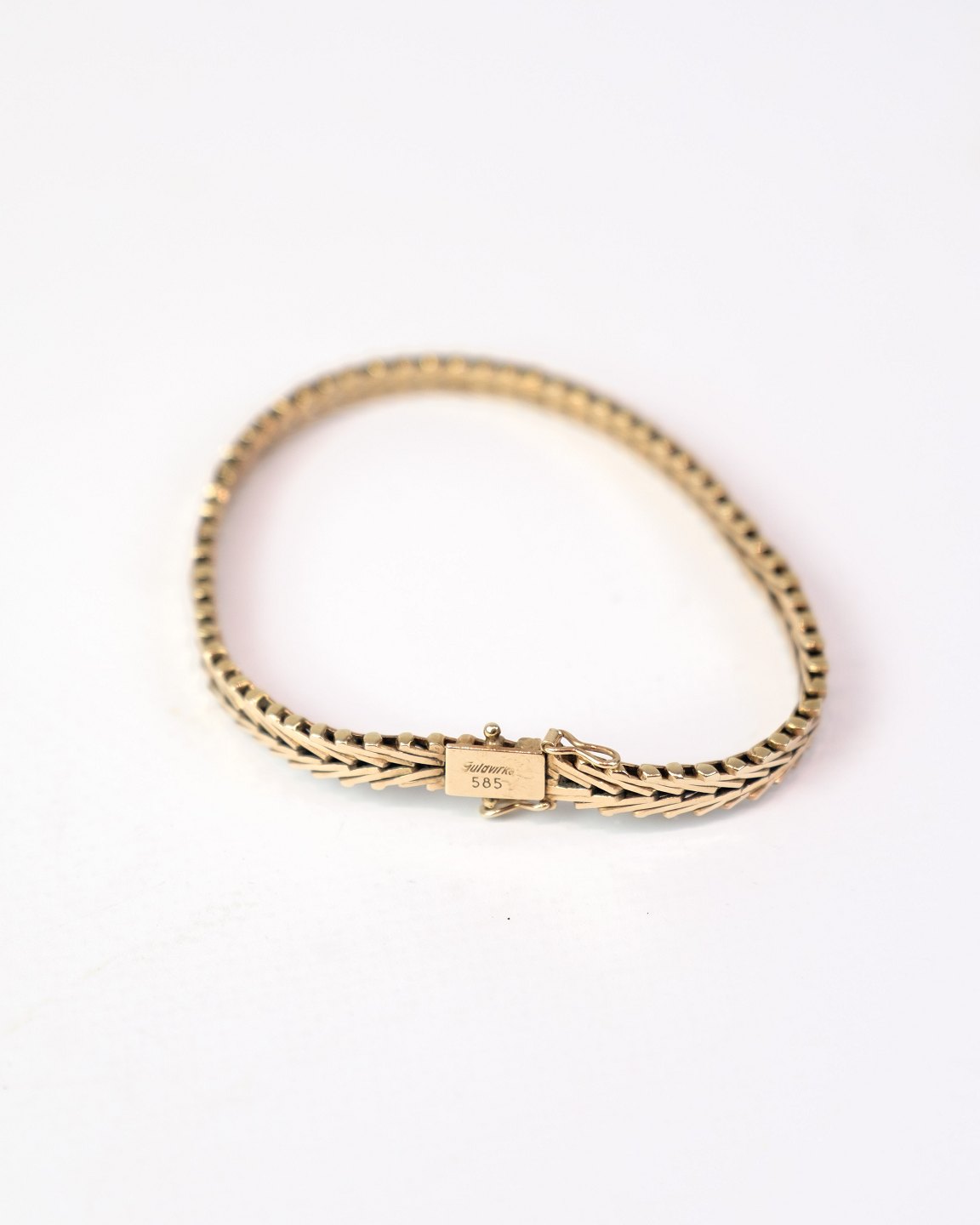 Genève armbånd i 14 kt. guld, stemplet 585, signeret Guldvirke. Med kasselås og sikkerhedshægter.