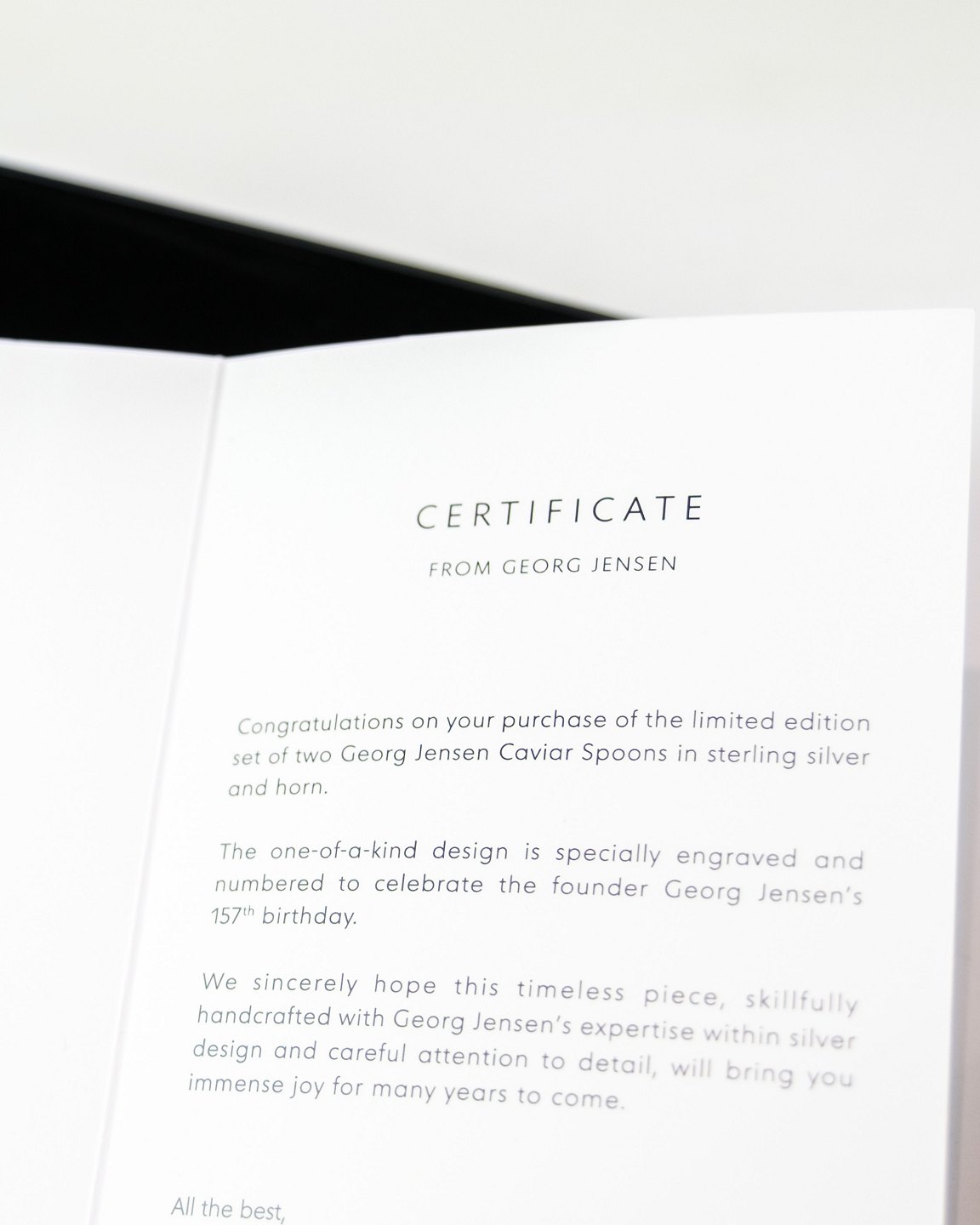 Elegant Kaviarske fra Georg Jensen udført i sterlingsølv. Kaviarskeen er udført i 925 sterlingsølv og horn fra opdrættet kvæg. Den er håndlavet med omhu gennem en tidskrævende proces, og sterlingsølvet har til slut fået en oxideret finish, som fremhæver de smukke håndlavede detaljer. Da horn er et natur materiale, kan der forekomme variationer i udseendet, og derfor er ikke to skeer ens.