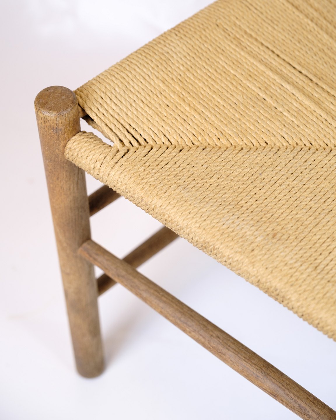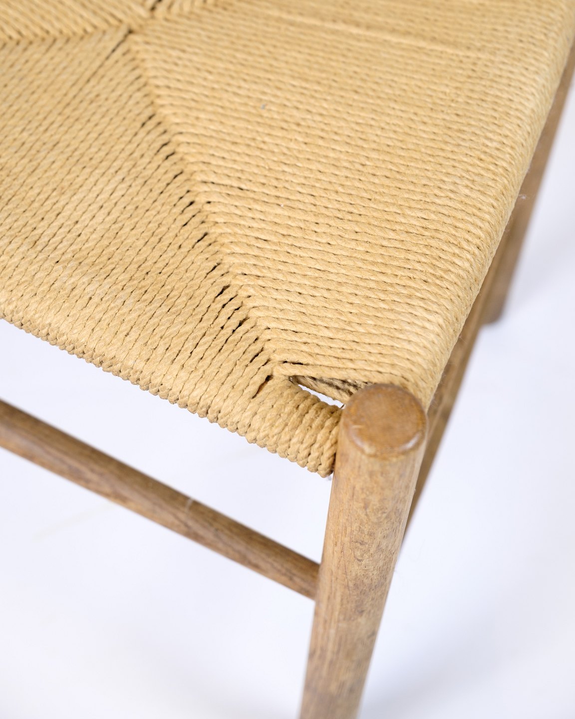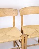 Sæt af to spisebordsstole, model J39, også kendt som Folkestolen. Designet af Børge Mogensen i 1947 og produceret af FDB Møbler. Stolene er udført i massivt egetræ med sæder i papirgarnflet, hvilket giver en robust og komfortabel siddeoplevelse.