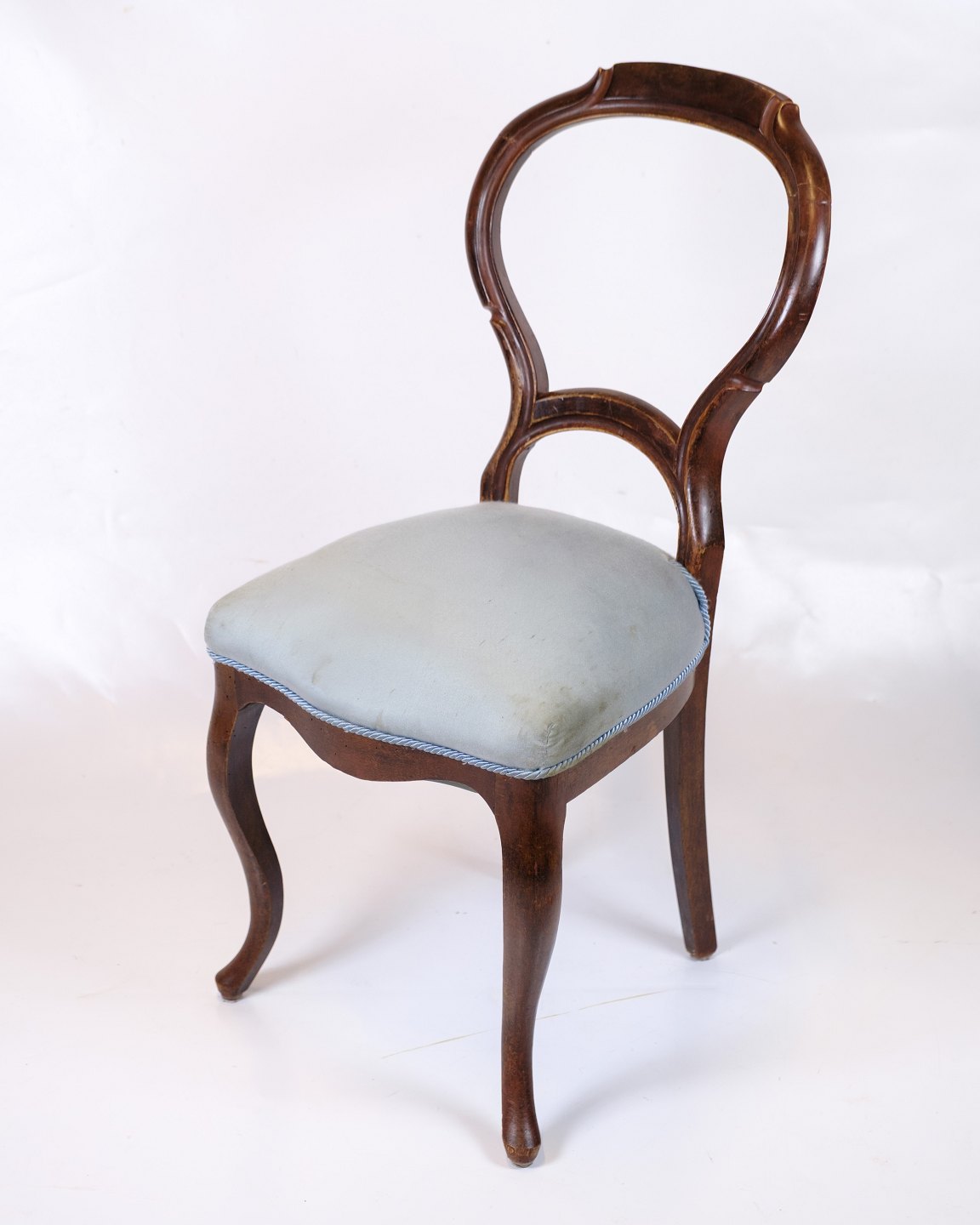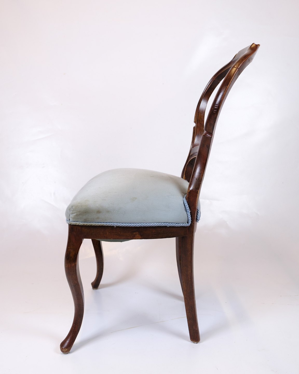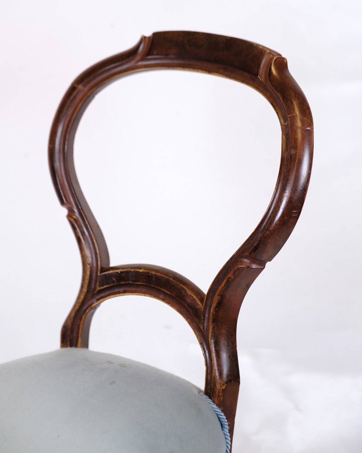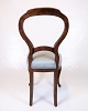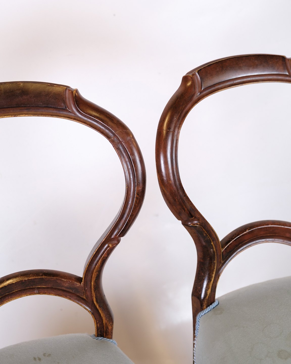 SolgtSæt af 2 rokokostole fra ca. 1860. Udført i mahogni med lyseblåt stof. Klassiske detaljer og smukt tidstypisk udtryk.