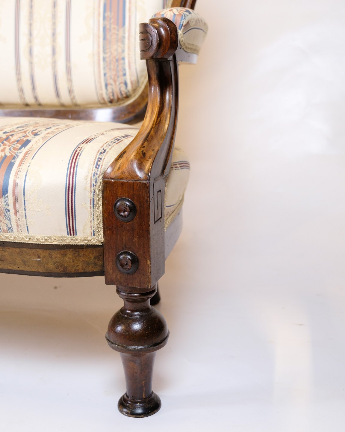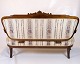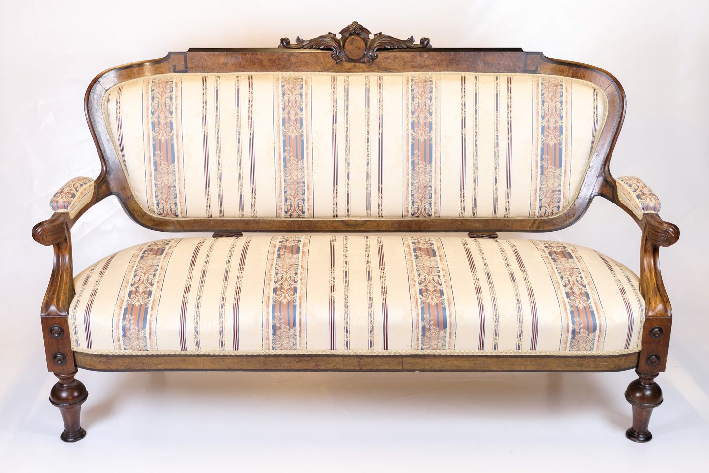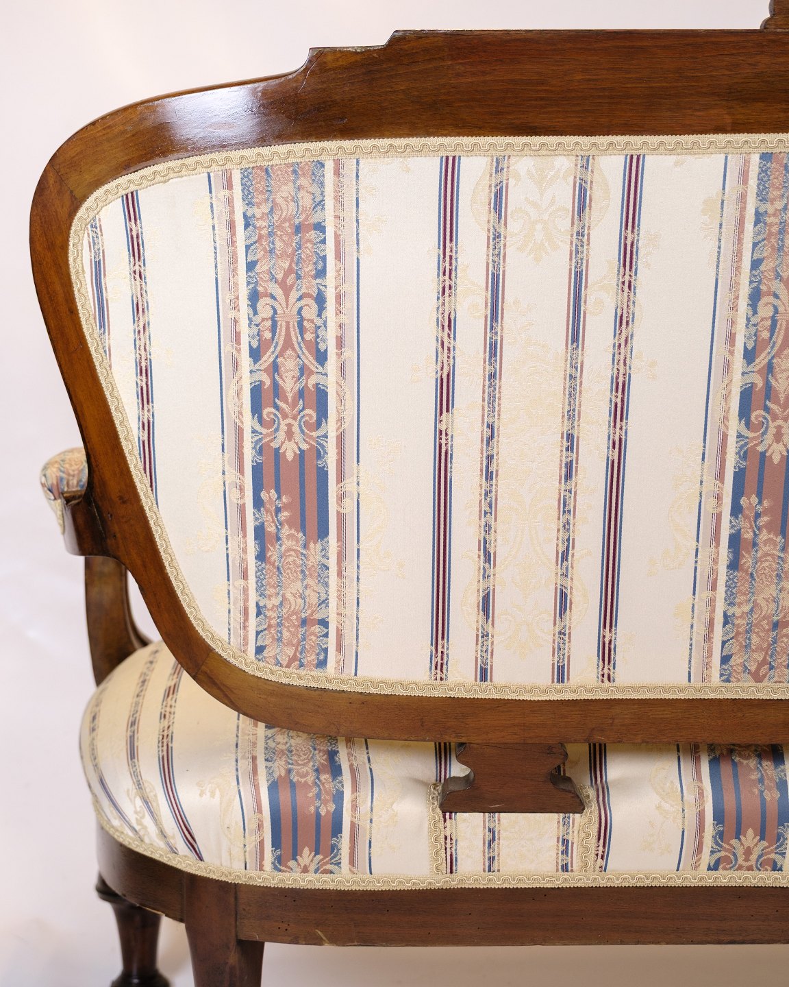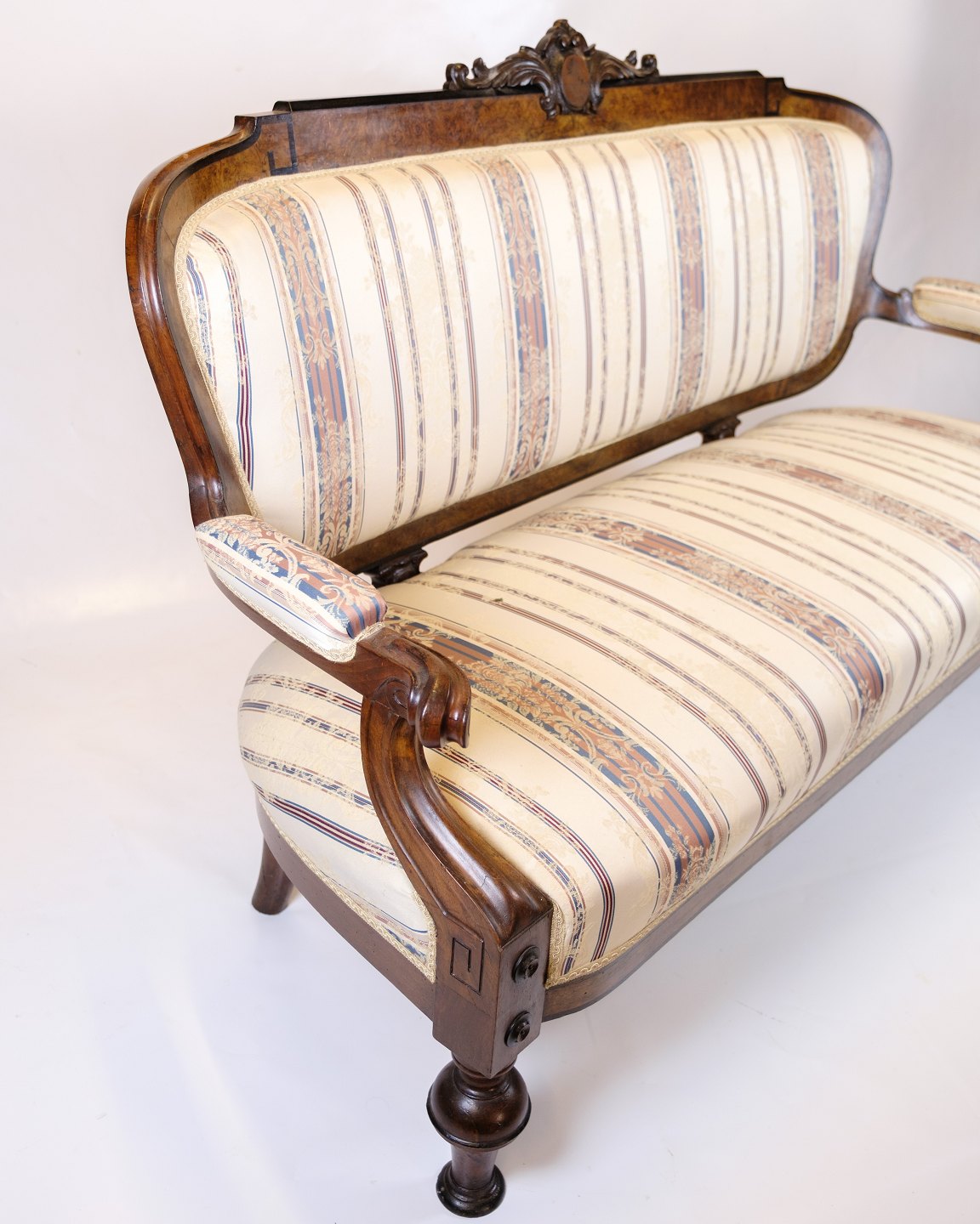 Antik 3-personers sofa i klunkestil fra 1890’erne. Nøddetræ med drejede ben og stribet polstring. Klassisk møbel fra sen-1800-tallet.