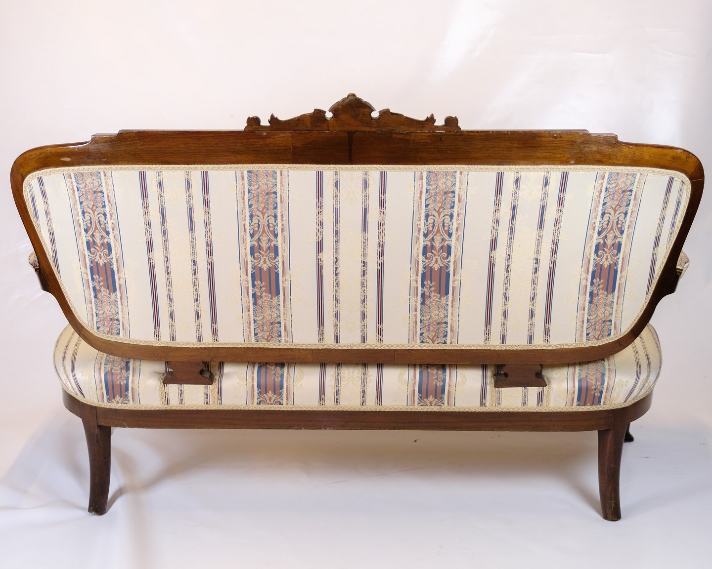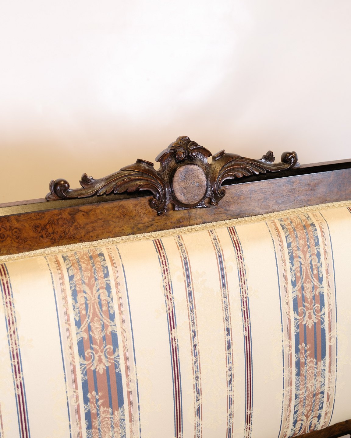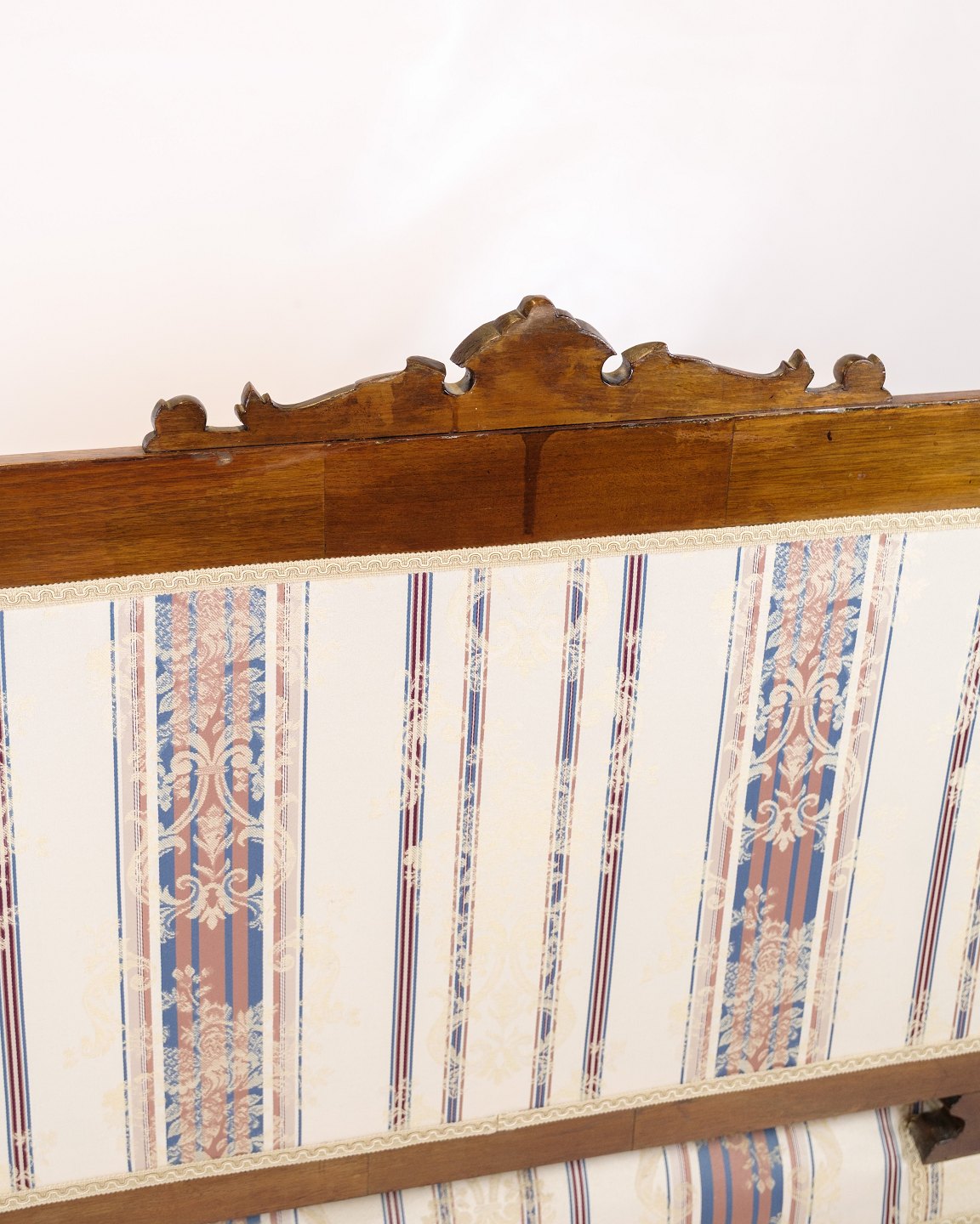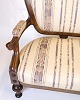 Antik 3-personers sofa i klunkestil fra 1890’erne. Nøddetræ med drejede ben og stribet polstring. Klassisk møbel fra sen-1800-tallet.