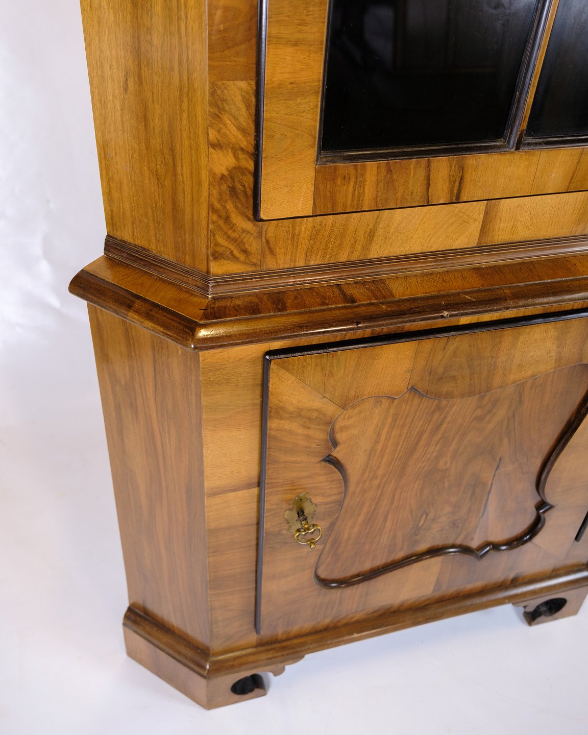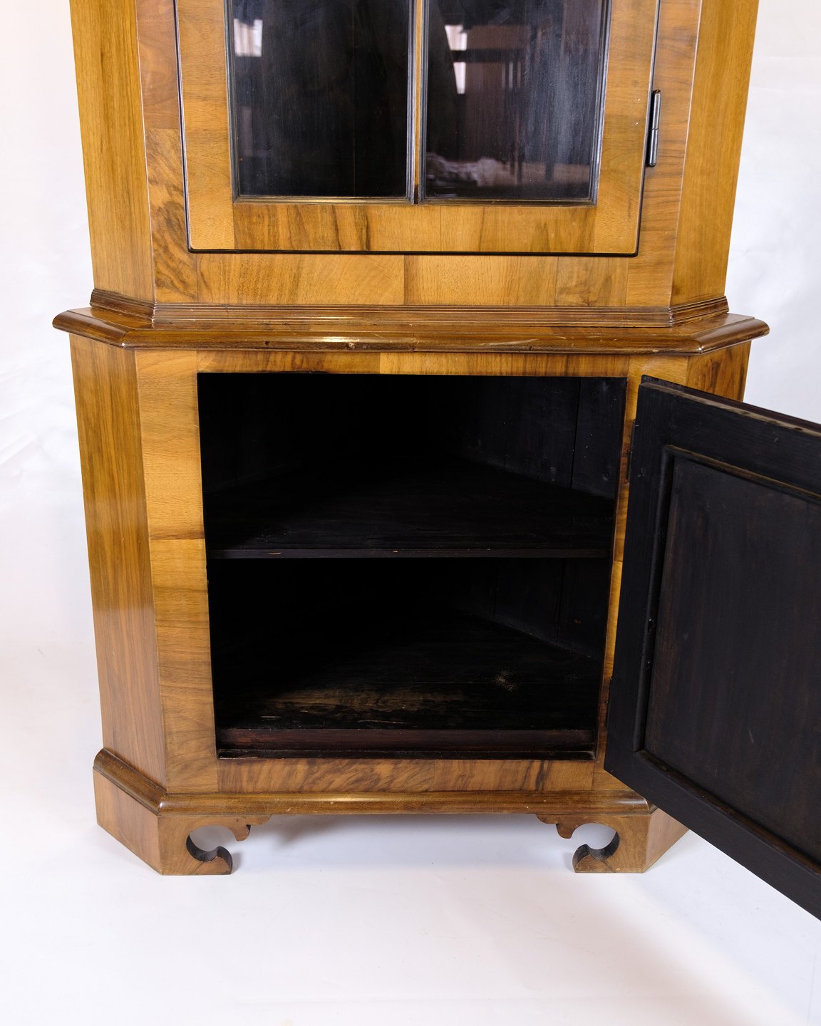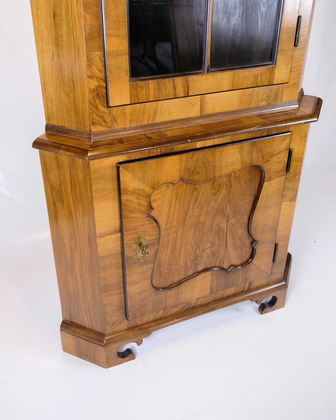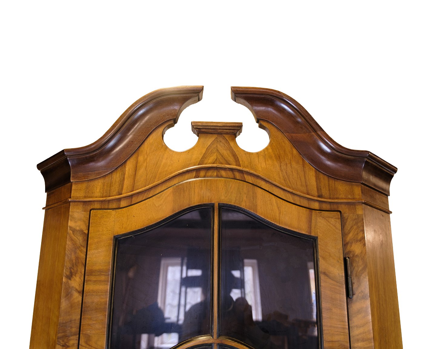 Antikt vitrineskab i barokstil fra ca. 1900. Udført i nøddetræ med glaslåge og sprosser. Elegant hjørneskab med klassisk udtryk.