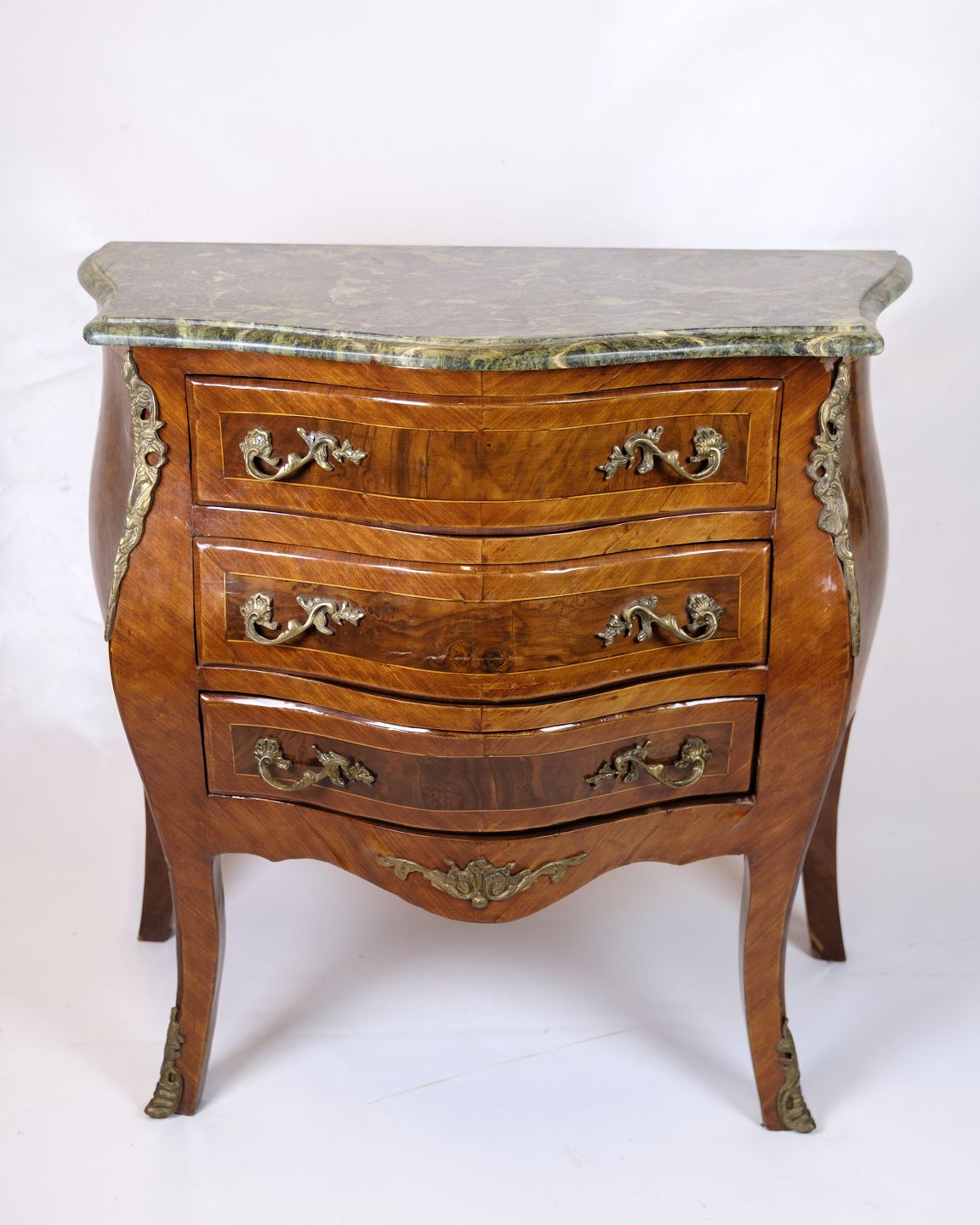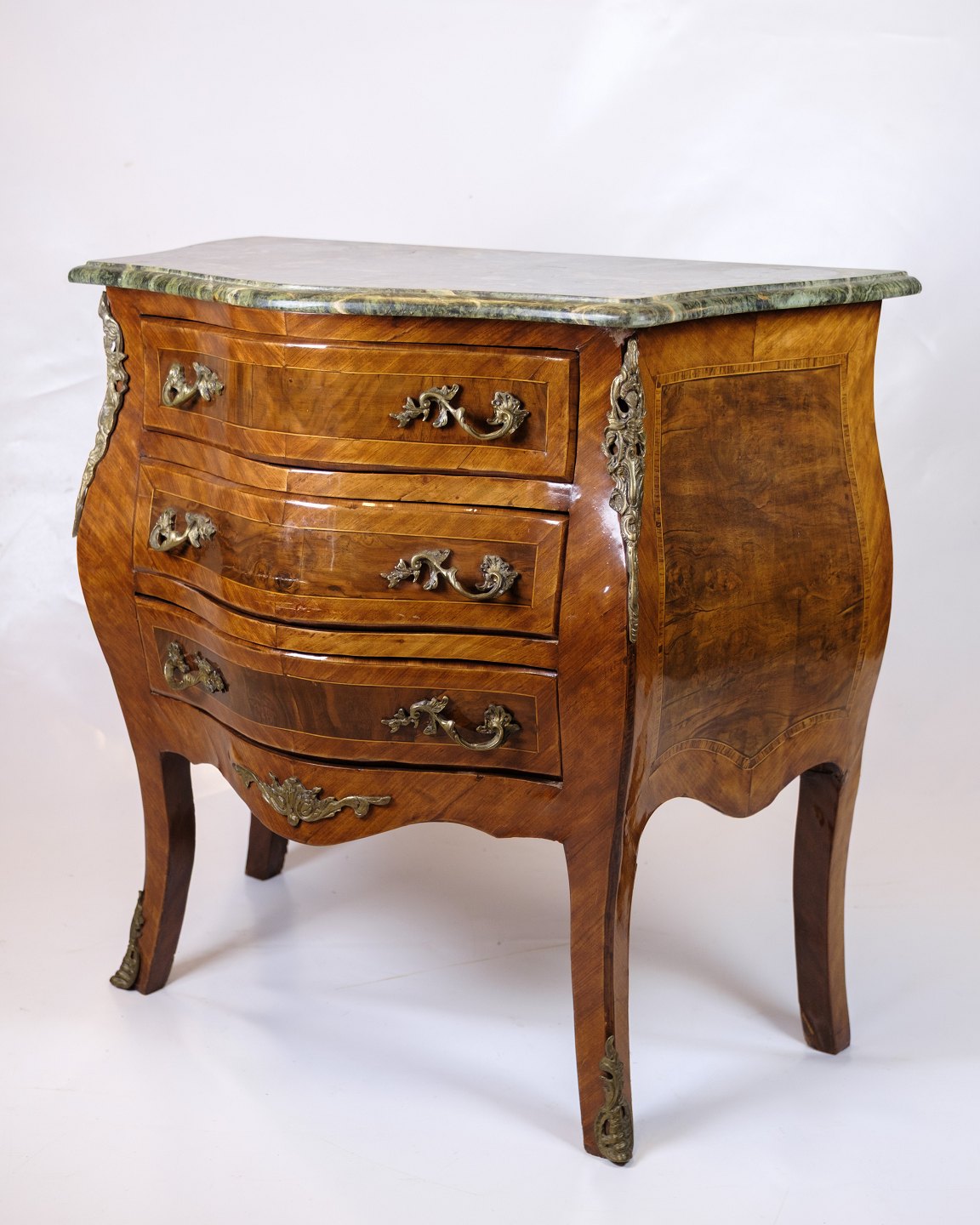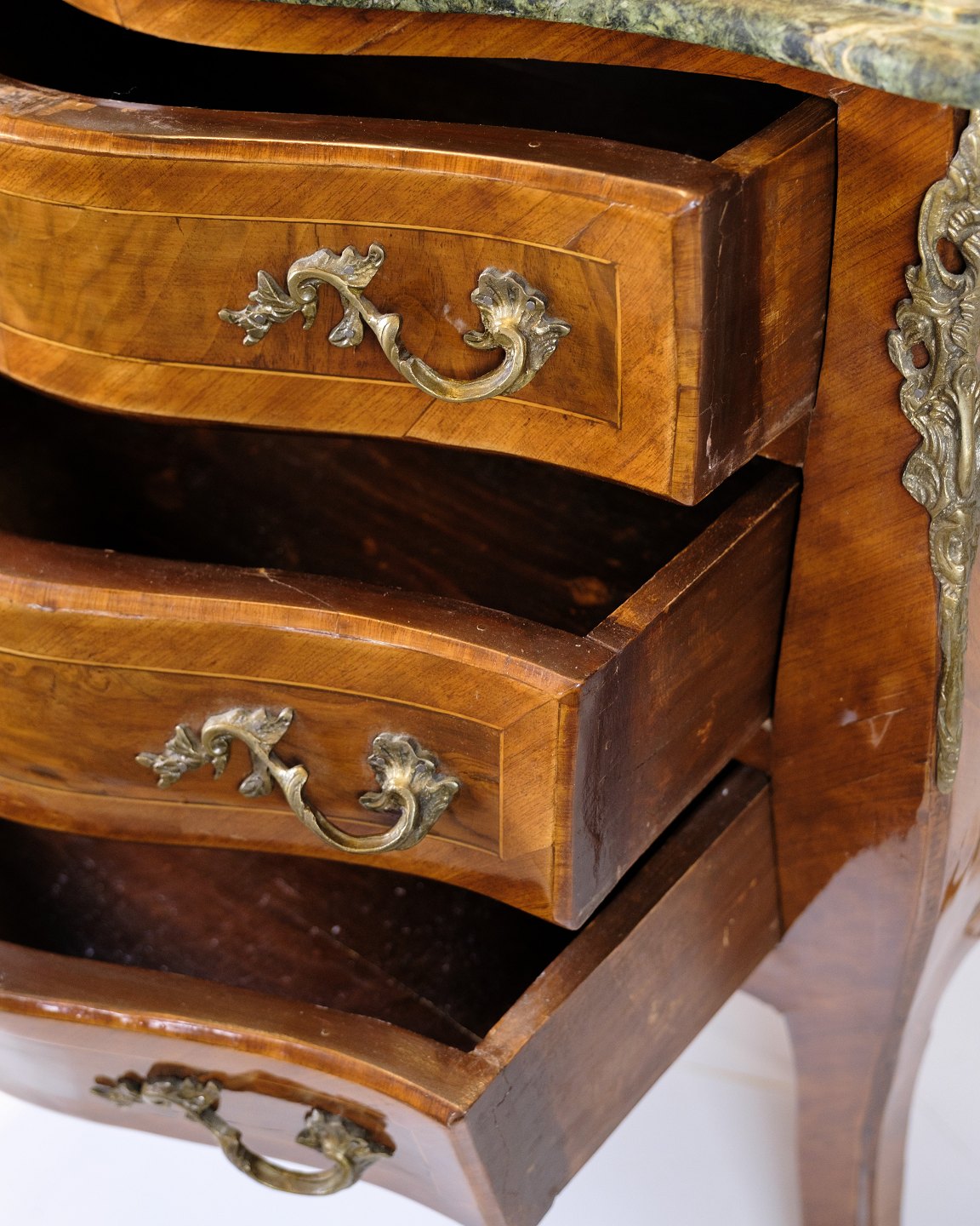 Kommode i rokokostil med marmorplade og messinggreb. Udført i nøddetræ. Klassisk møbel med dekorativt udtryk.