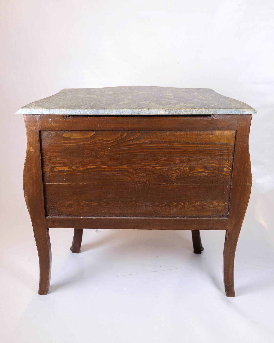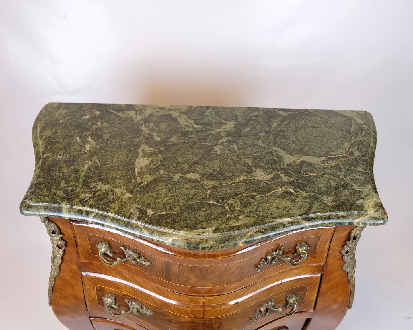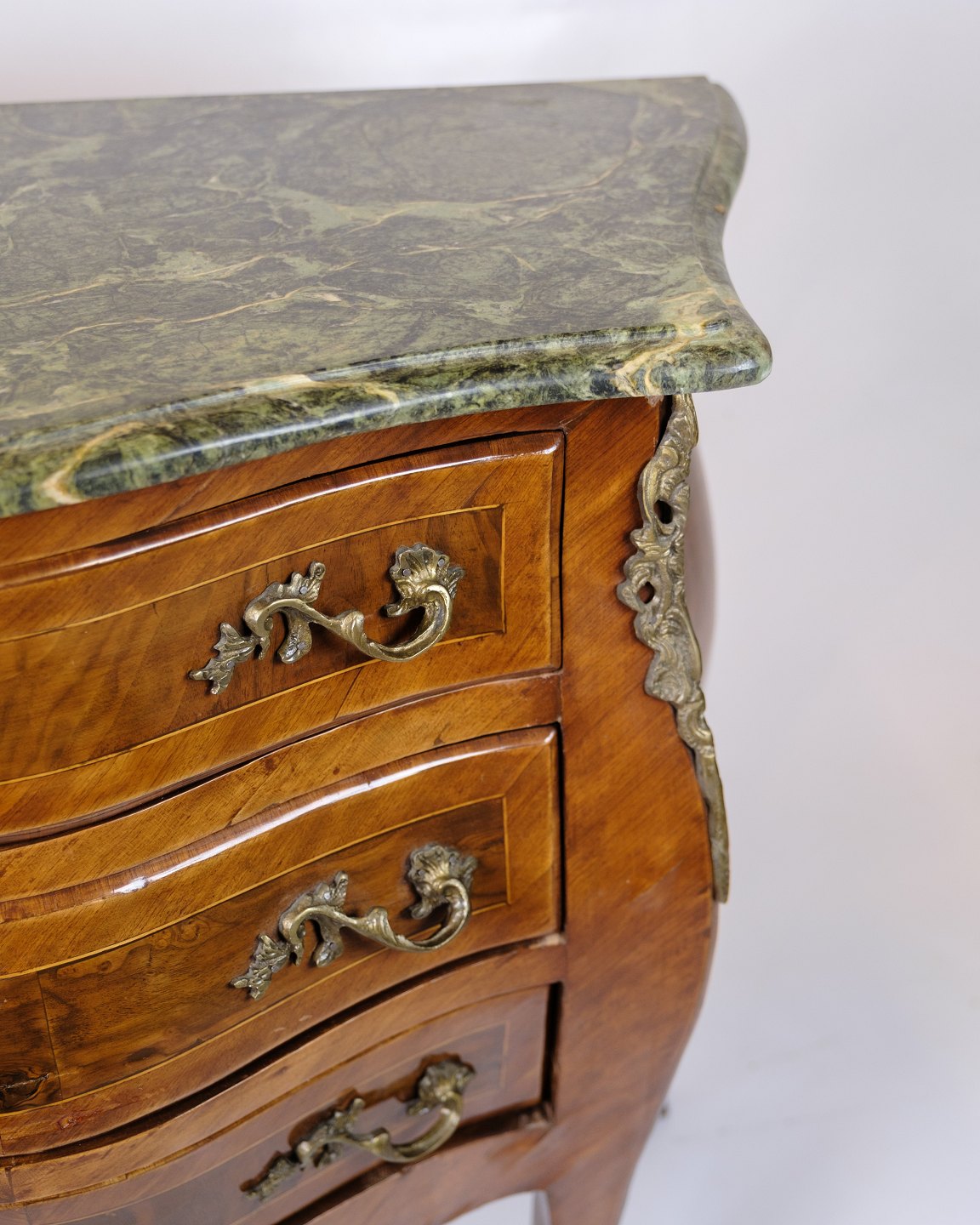 Kommode i rokokostil med marmorplade og messinggreb. Udført i nøddetræ. Klassisk møbel med dekorativt udtryk.