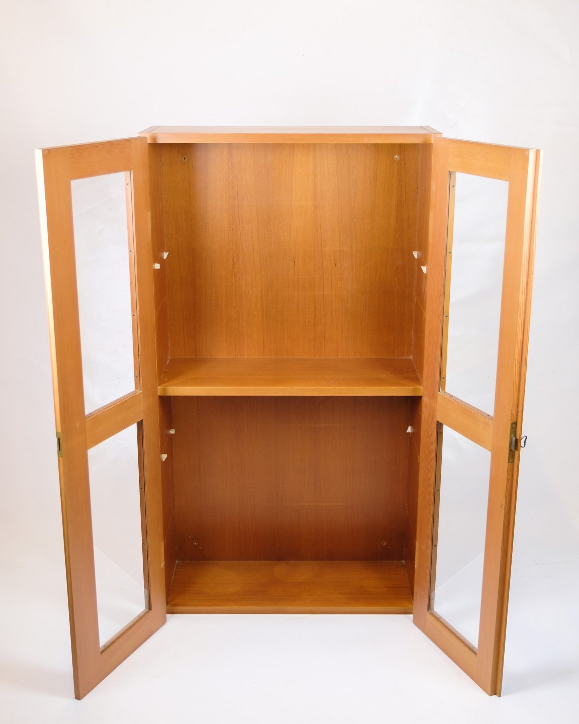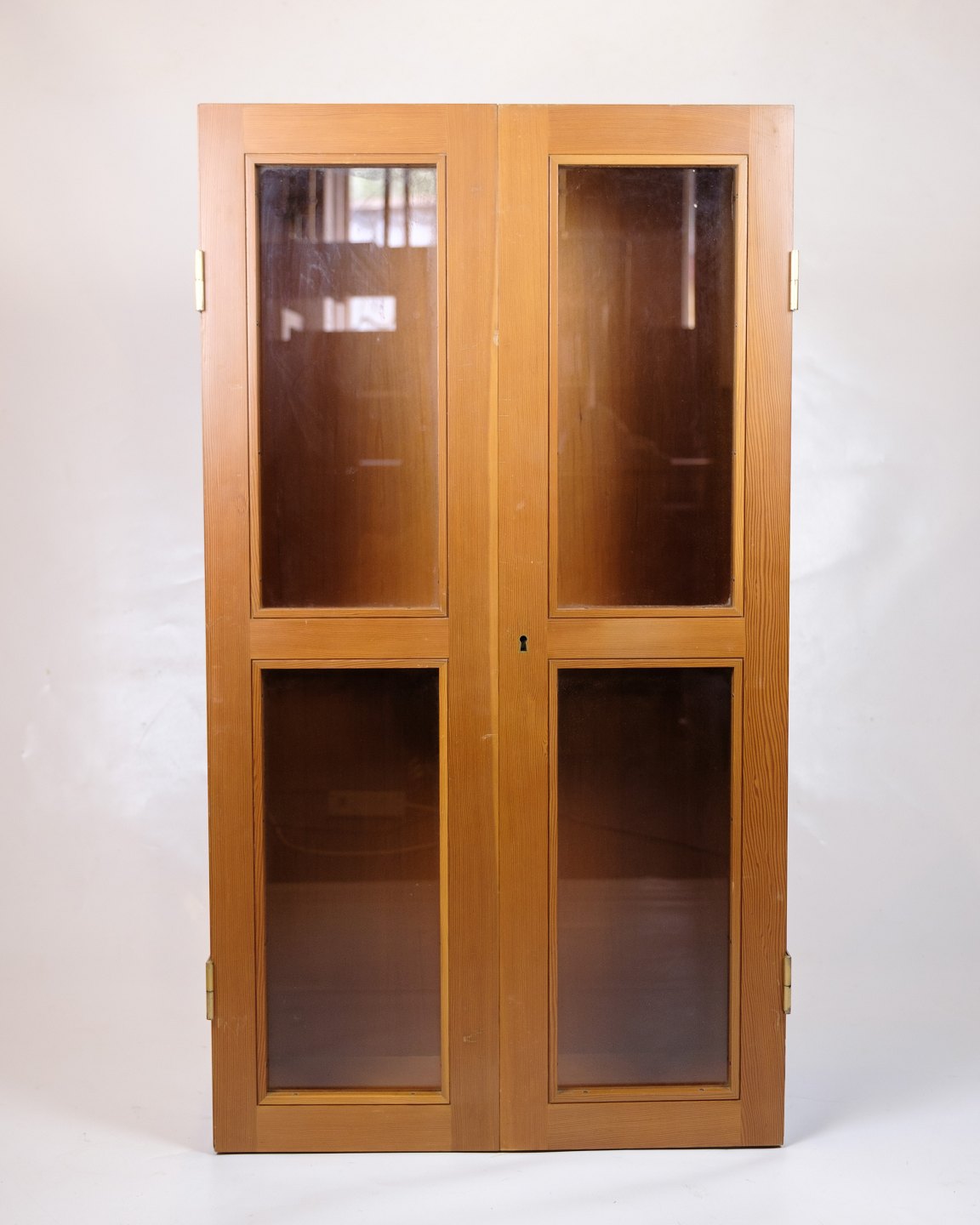 Sæt af to vitrineskabe i Oregon pine fra 1960’erne. Dansk design med glaslåger og faste hylder. Elegant og funktionelt.
