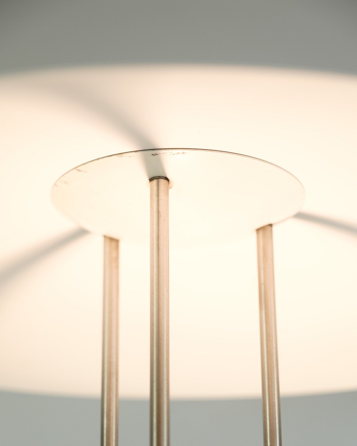 Gino gulvlampe, model Gino, designet af Bjarne Frost og Ole Jespersen i 1980’erne og produceret af Nordisk Solar Compagni. Stellet er forkromet metal og top skærmen er lavet af hvidlakeret metal.