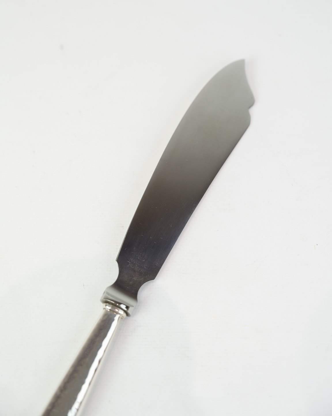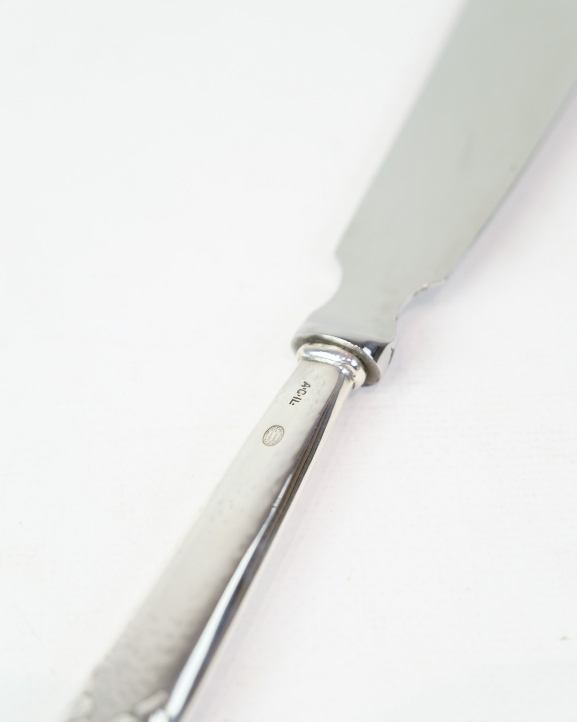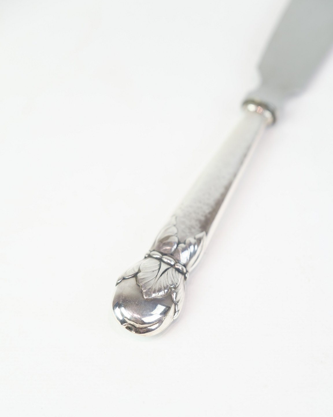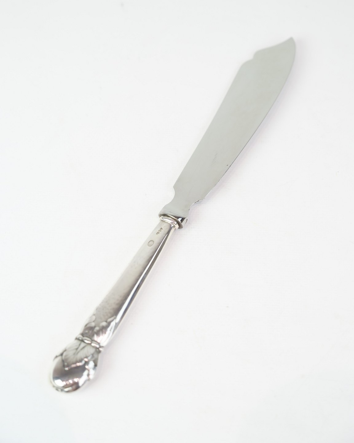 Lagkagekniv fra A.C. Illum, København. Tretårnet sølv stemplet 825, ca. midt 1900-tallet. Længde 28 cm. Illum var kendt for høj kvalitet.