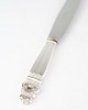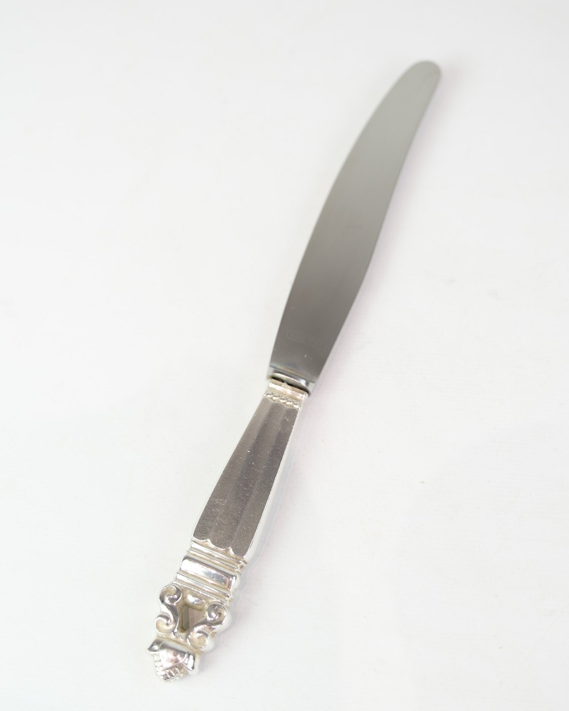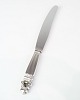 Georg Jensen middagskniv i Konge mønster. Kort skaft, sterling sølv og stål. Design af Johan Rohde 1915. Længde 24,5 cm.