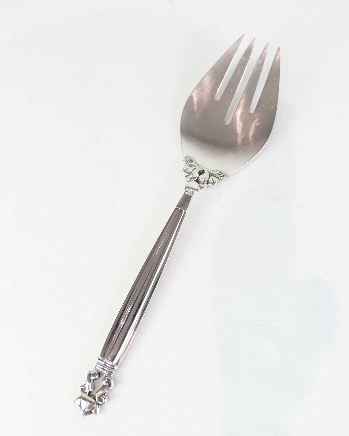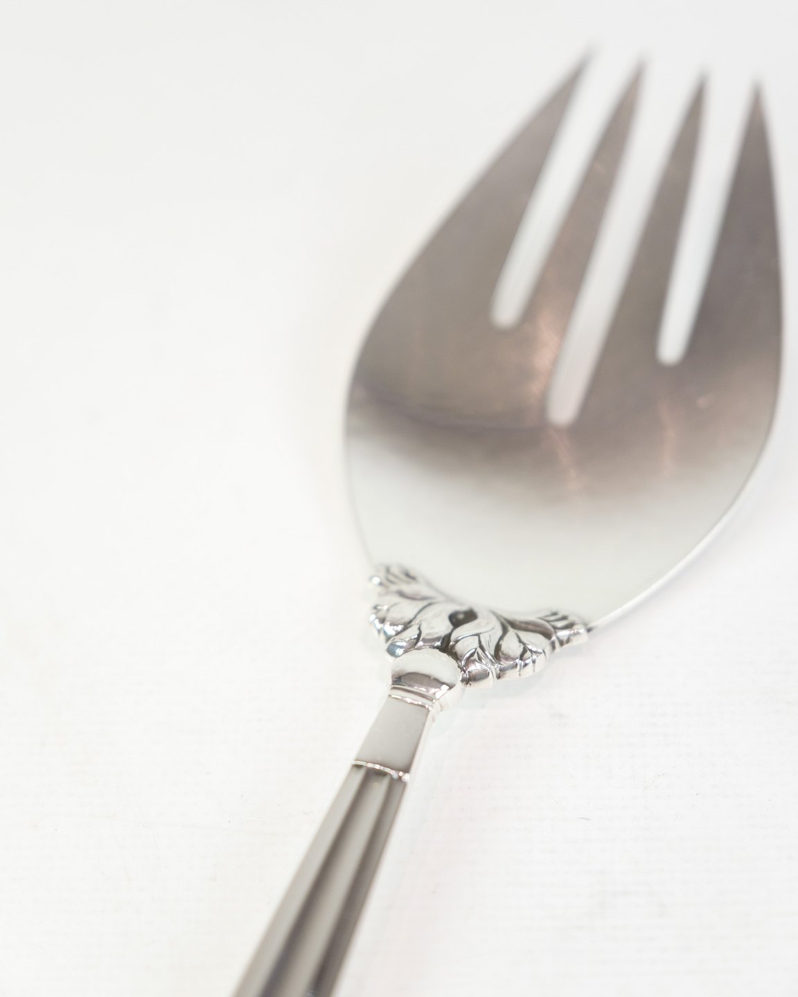 Georg Jensen serveringssæt i Konge mønster. Sterling sølv spade (No. 193, 26,5 cm) og gaffel (No. 114, 24 cm). Design af Johan Rohde 1915.